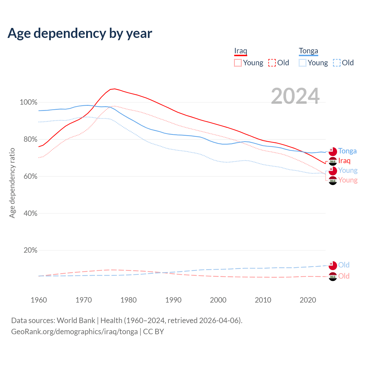 - The share of old-age demographic (65+) in Iraq is 3.41% vs 6.72% in Tonga.