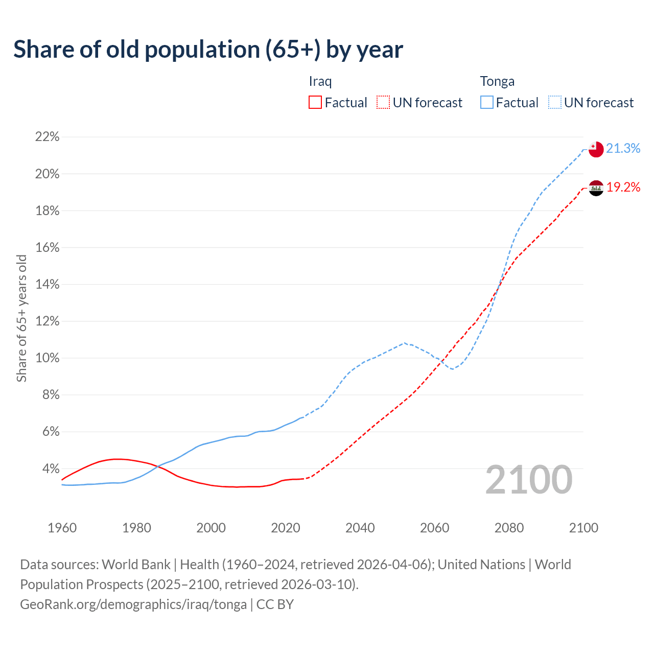 The share of older people aged 65 and over is 3.41% in Iraq and 6.72% in Tonga. Life expectancy in Iraq compared to Tonga .