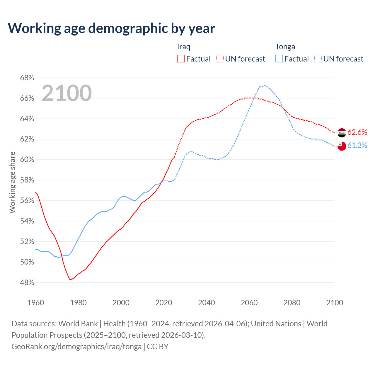 - Iraq has 29M working age adults (aged 15-64) vs 59.8K in Tonga.