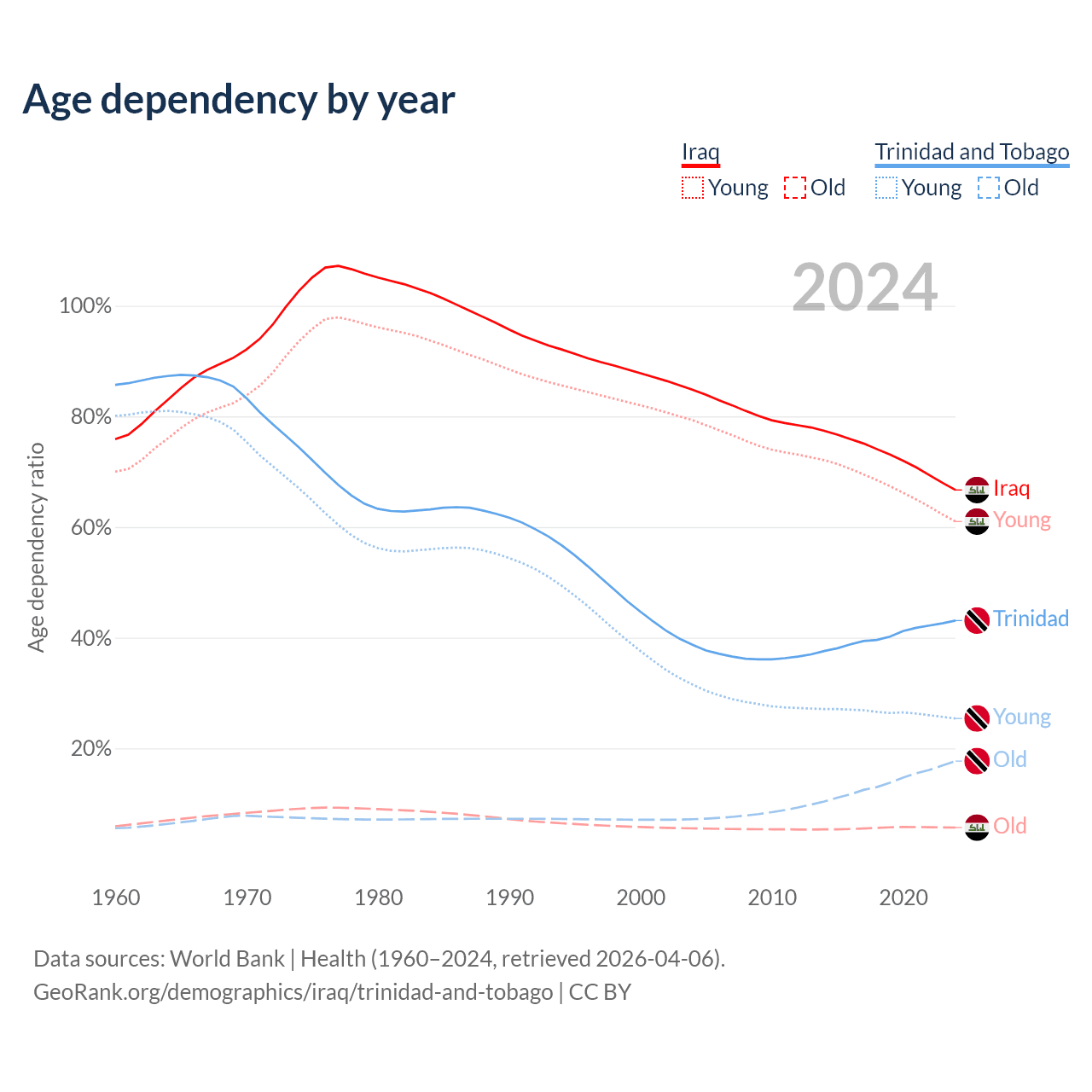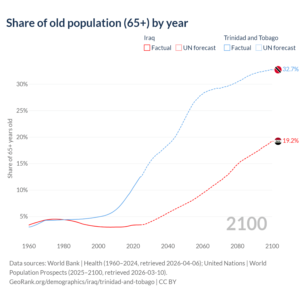 The share of older people aged 65 and over is 3.41% in Iraq and 12.4% in Trinidad and Tobago. Life expectancy in Iraq compared to Trinidad and Tobago .