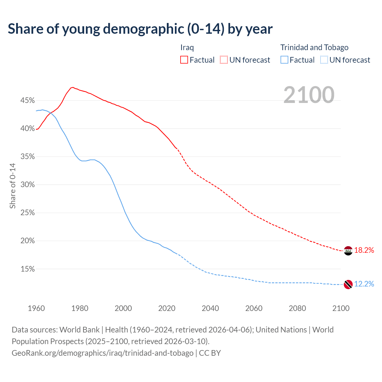 - The share of young demographic (0-15 years old) in Iraq is 36.6% vs 17.8% in Trinidad and Tobago.