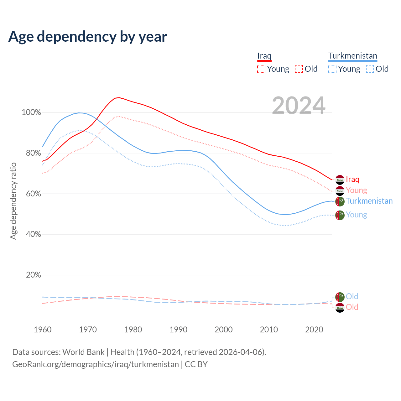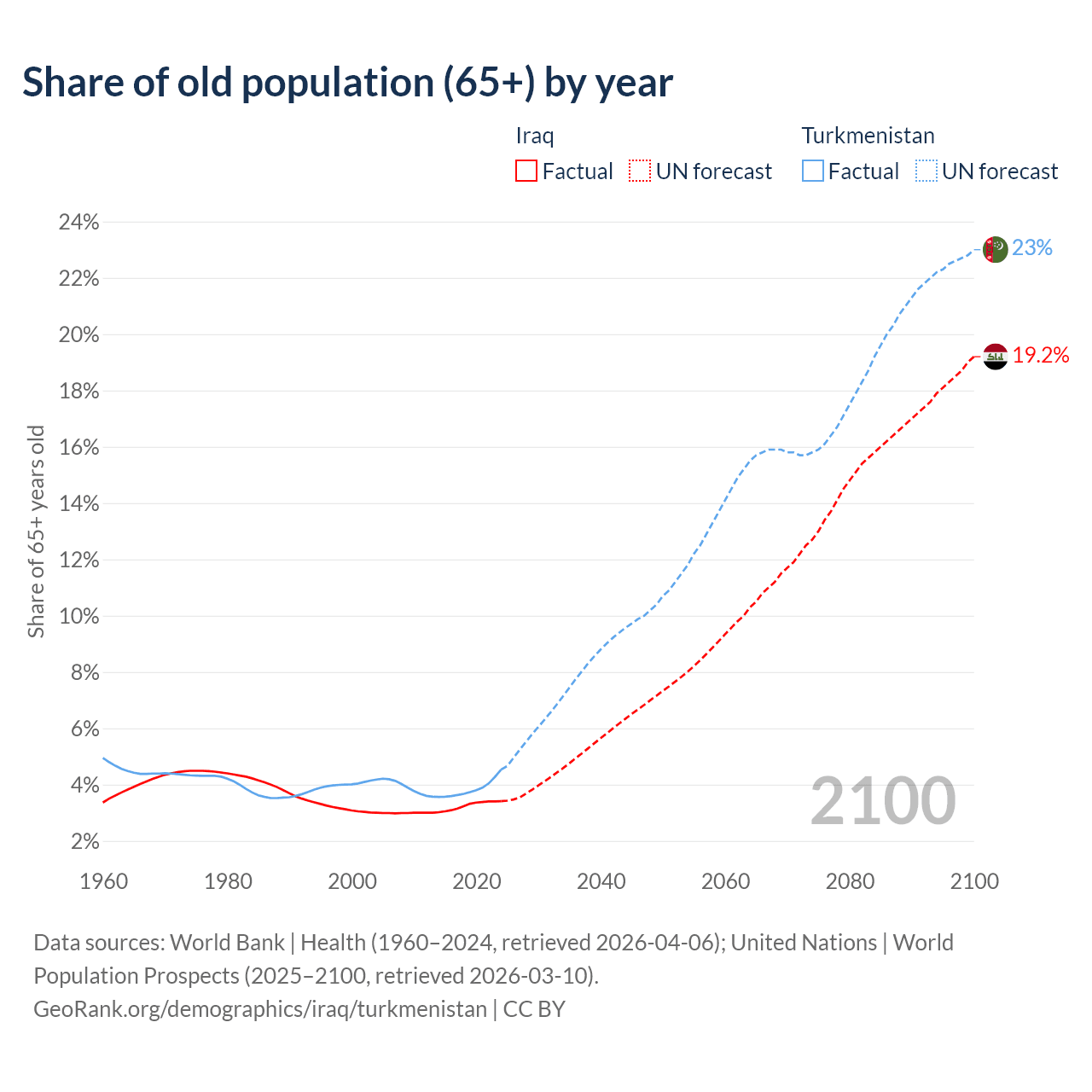 The share of older people aged 65 and over is 3.41% in Iraq and 4.53% in Turkmenistan. Life expectancy in Iraq compared to Turkmenistan .