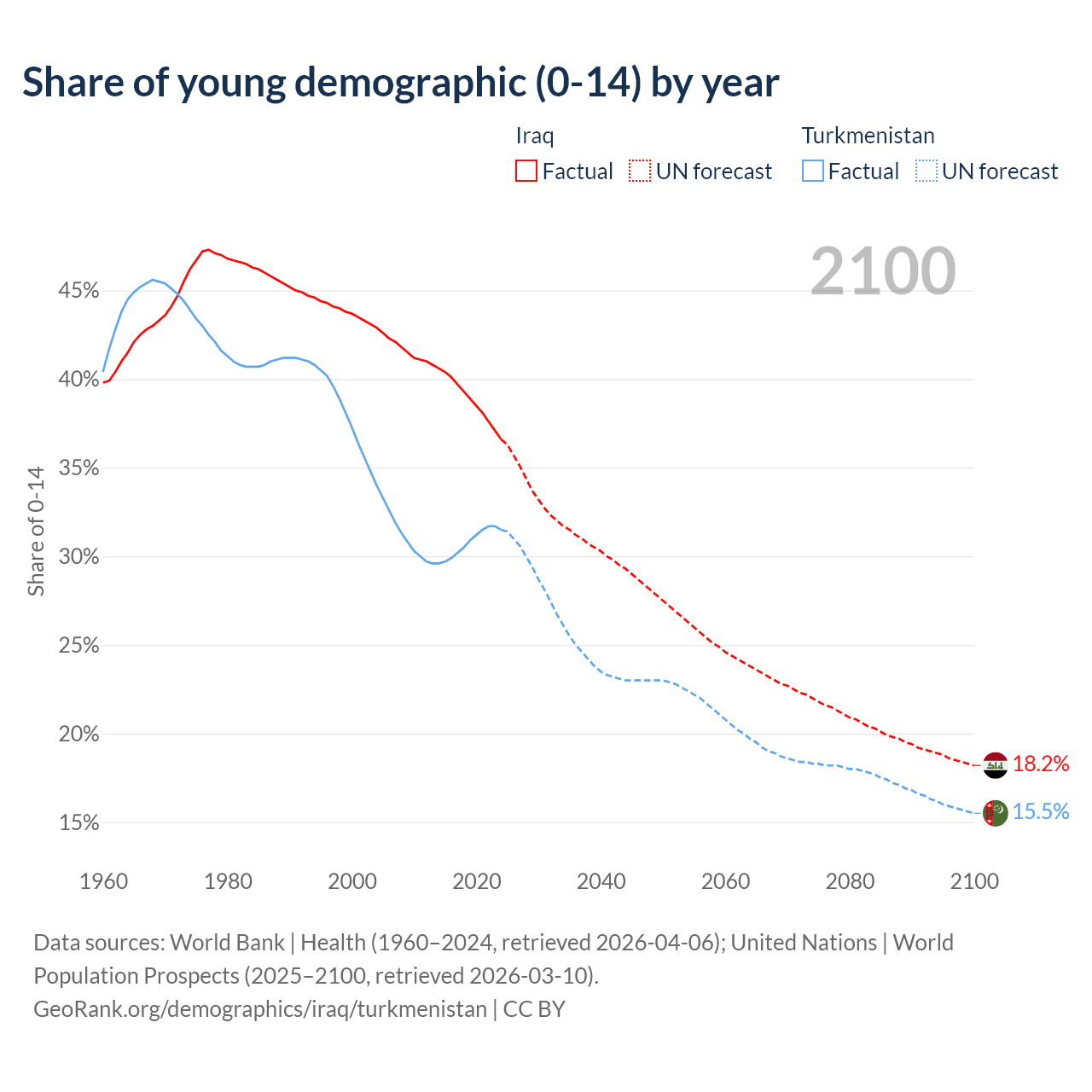 - The share of young demographic (0-15 years old) in Iraq is 36.6% vs 31.5% in Turkmenistan.