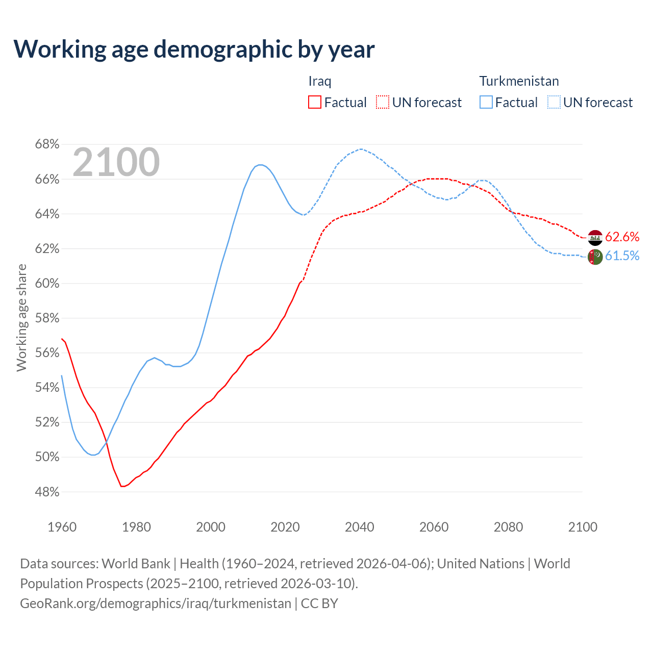 - Iraq has 29M working age adults (aged 15-64) vs 4.97M in Turkmenistan.