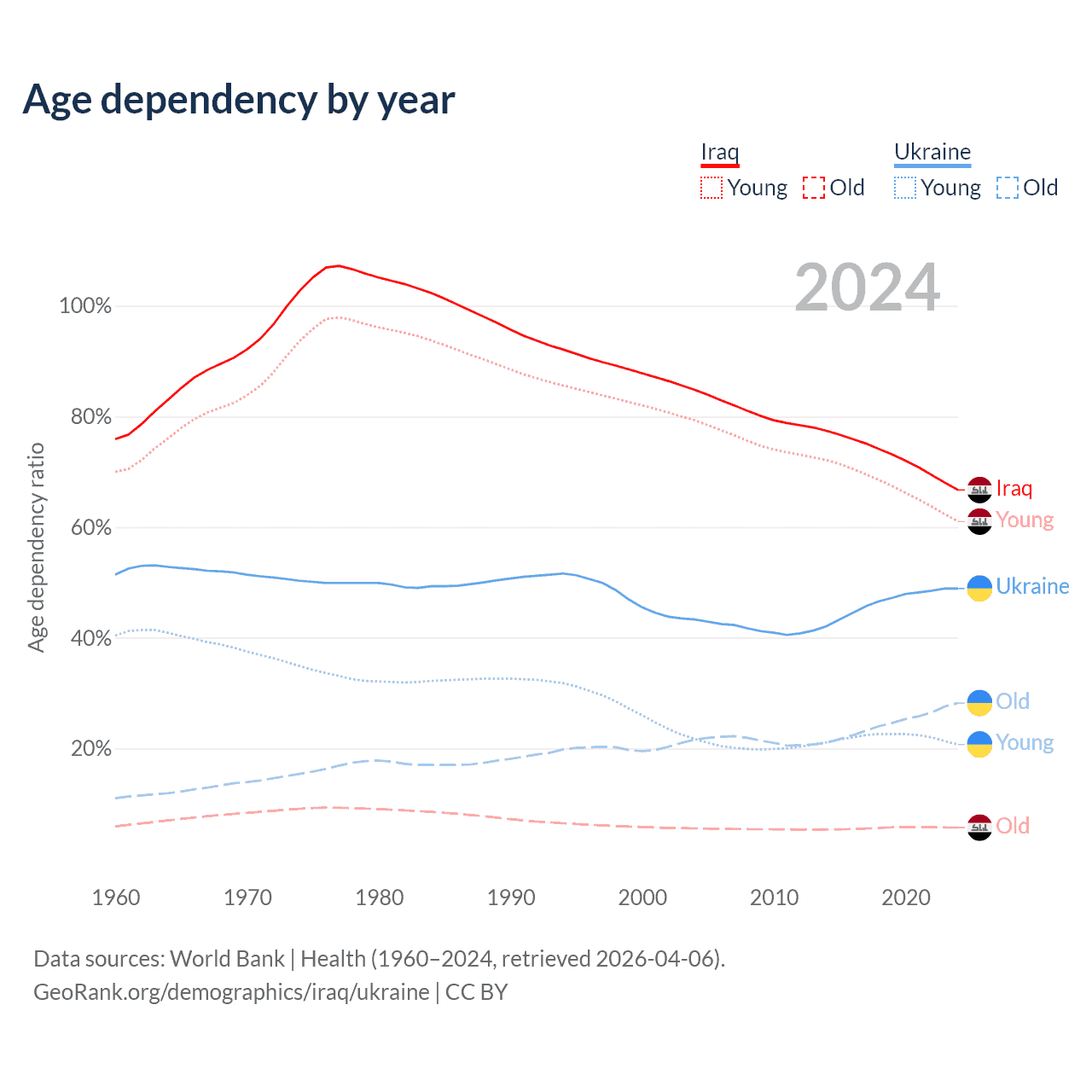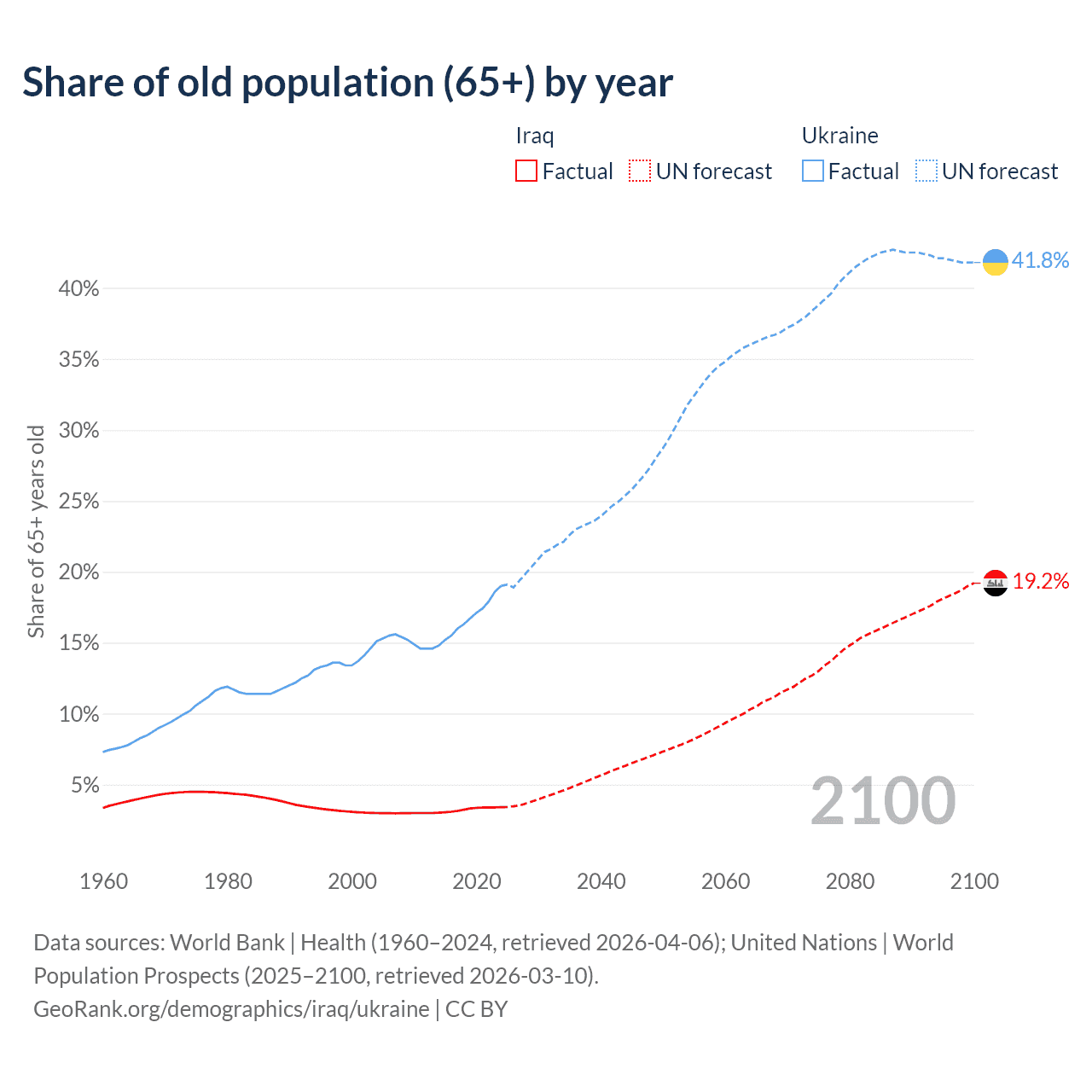 The share of older people aged 65 and over is 3.41% in Iraq and 19% in Ukraine. Life expectancy in Iraq compared to Ukraine .