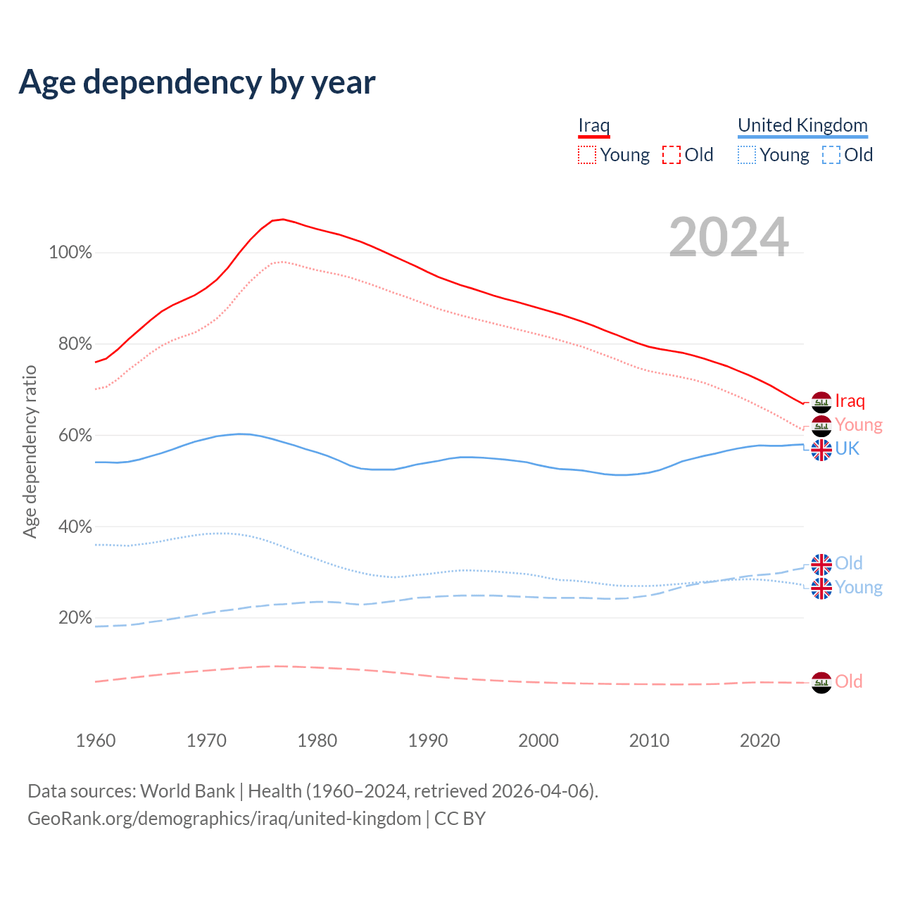 The share of older people aged 65 and over is 3.41% in Iraq and 19.5% in the United Kingdom. Life expectancy in Iraq compared to the United Kingdom .
