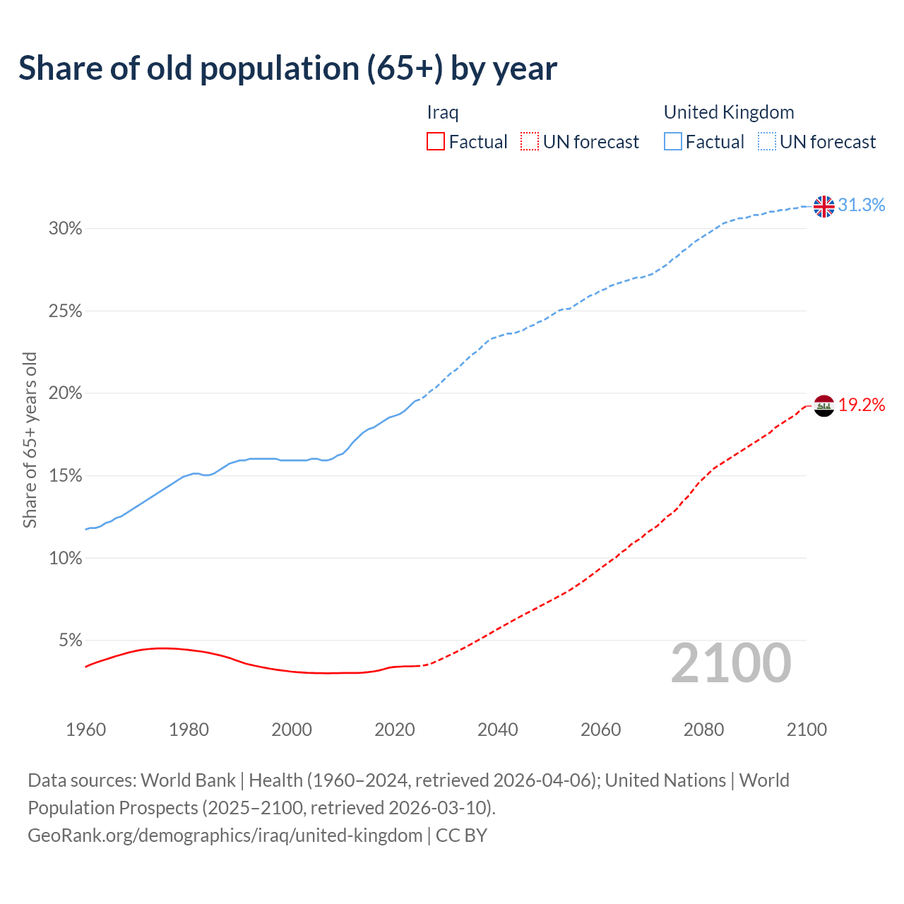- The share of old-age demographic (65+) in Iraq is 3.41% vs 19.5% in the United Kingdom.