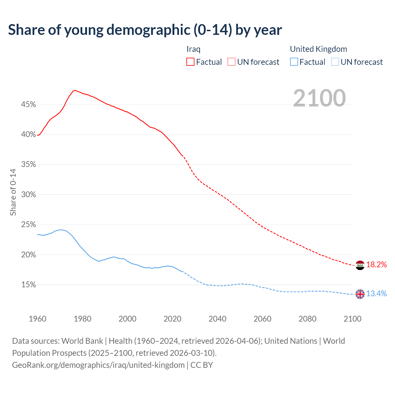 - The share of young demographic (0-15 years old) in Iraq is 36.6% vs 17.2% in the United Kingdom.