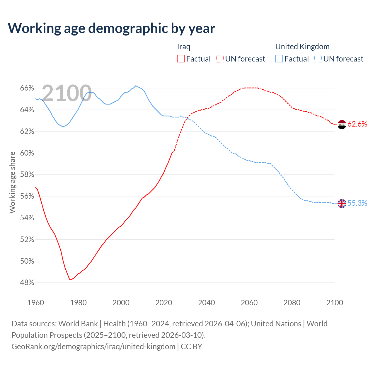 - Iraq has 29M working age adults (aged 15-64) vs 44.4M in the United Kingdom.