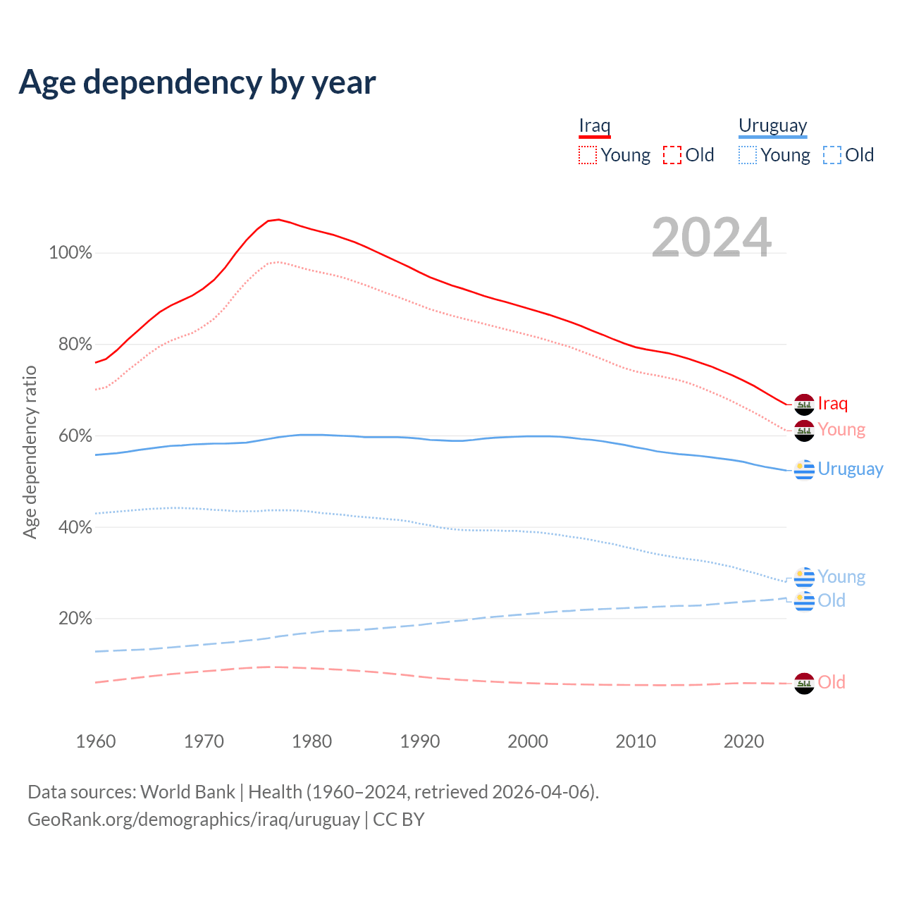 The share of older people aged 65 and over is 3.41% in Iraq and 16% in Uruguay. Life expectancy in Iraq compared to Uruguay .