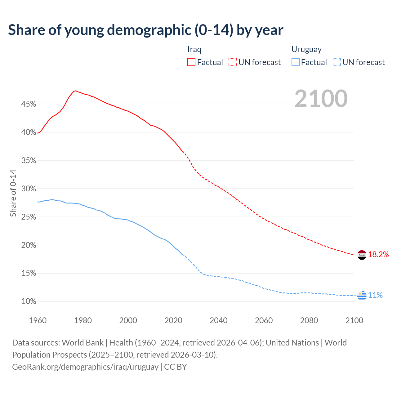 - The share of young demographic (0-15 years old) in Iraq is 36.6% vs 18.3% in Uruguay.