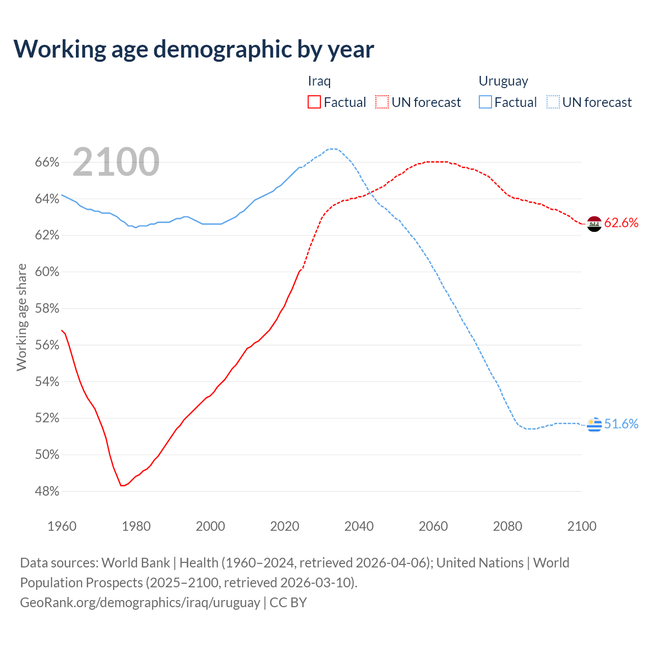 - Iraq has 29M working age adults (aged 15-64) vs 2.22M in Uruguay.