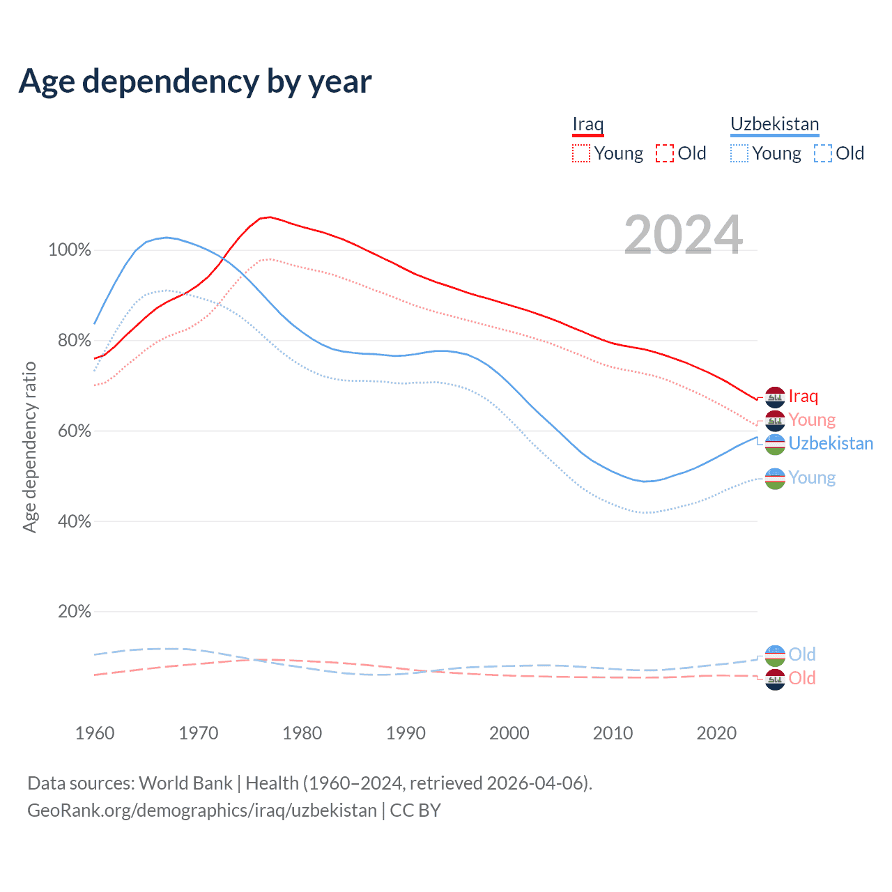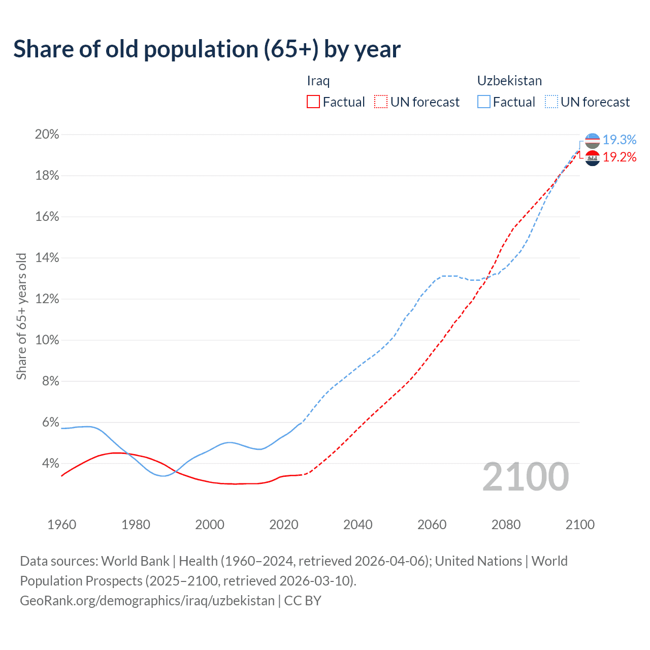 The share of older people aged 65 and over is 3.41% in Iraq and 5.86% in Uzbekistan. Life expectancy in Iraq compared to Uzbekistan .