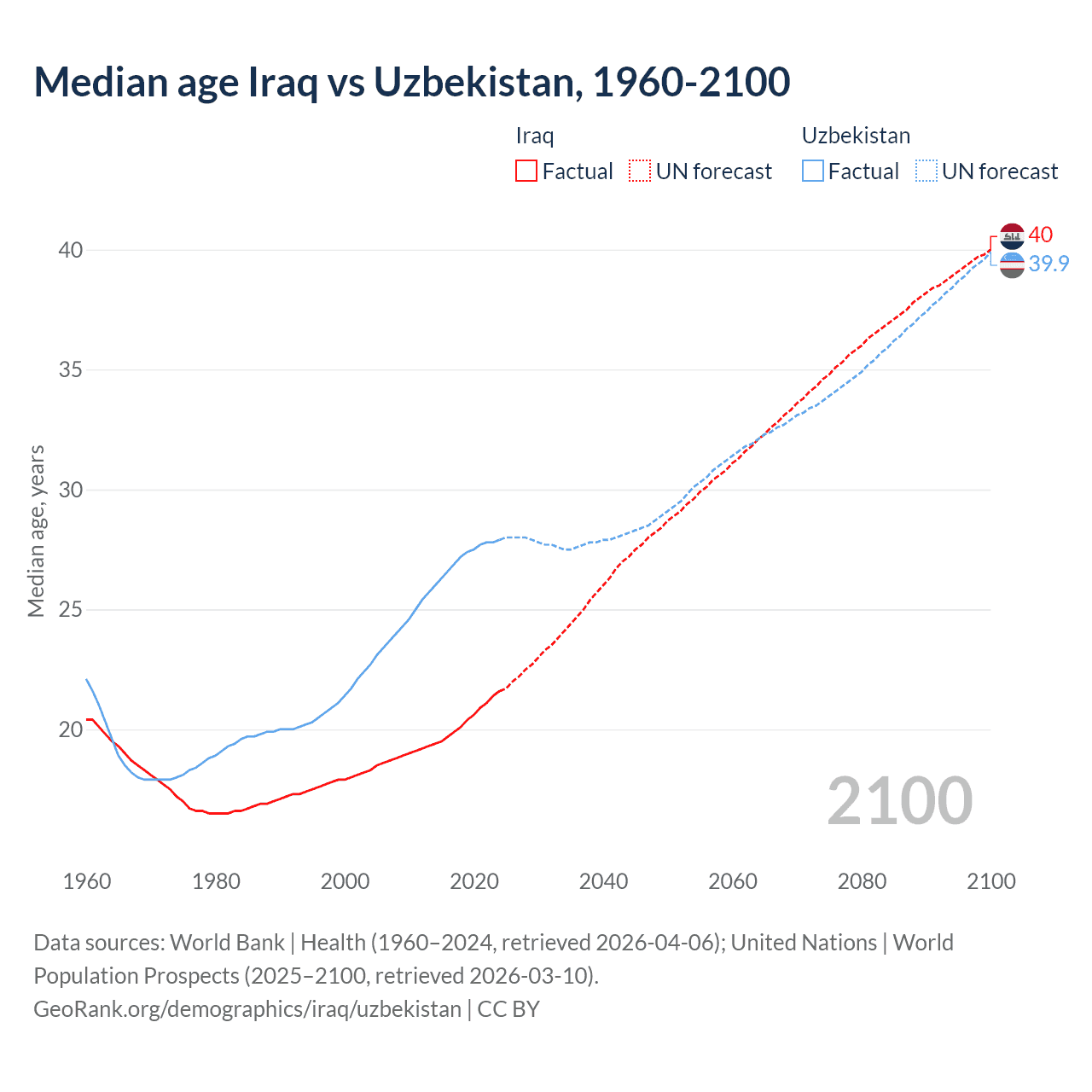 - Iraq is ranked 151/196 by median age (oldest to youngest) vs 116/196 for Uzbekistan.