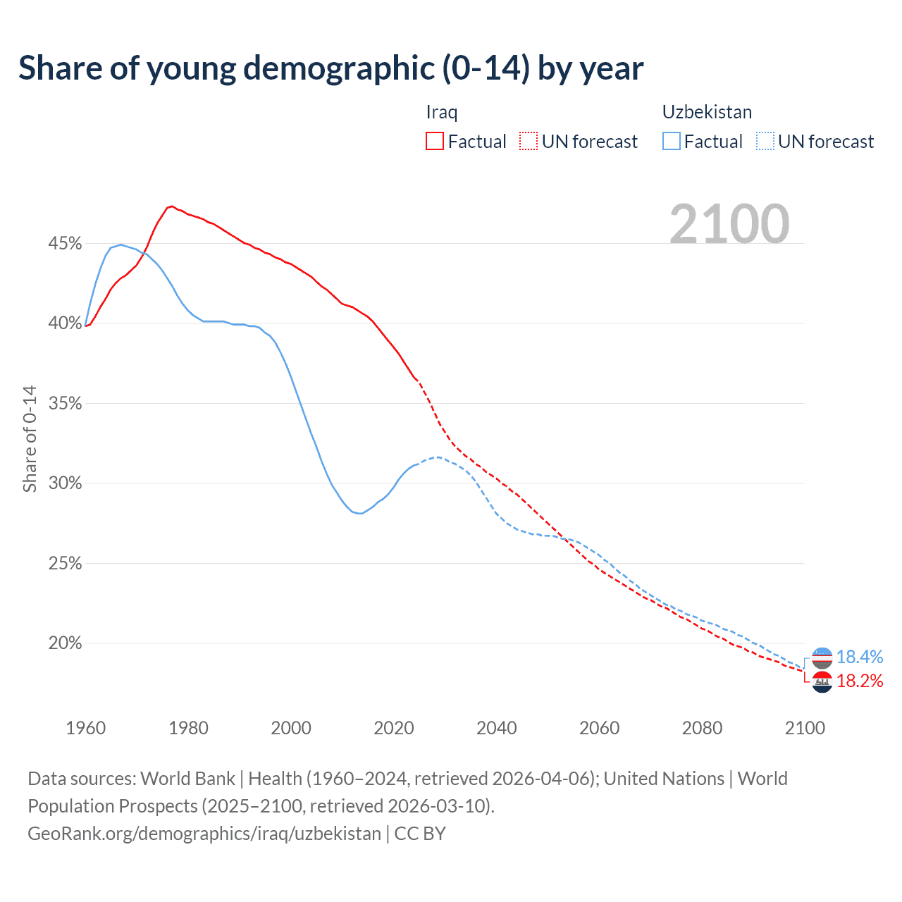 - The total fertility rate is 3.25 in Iraq compared to 3.5 in Uzbekistan.