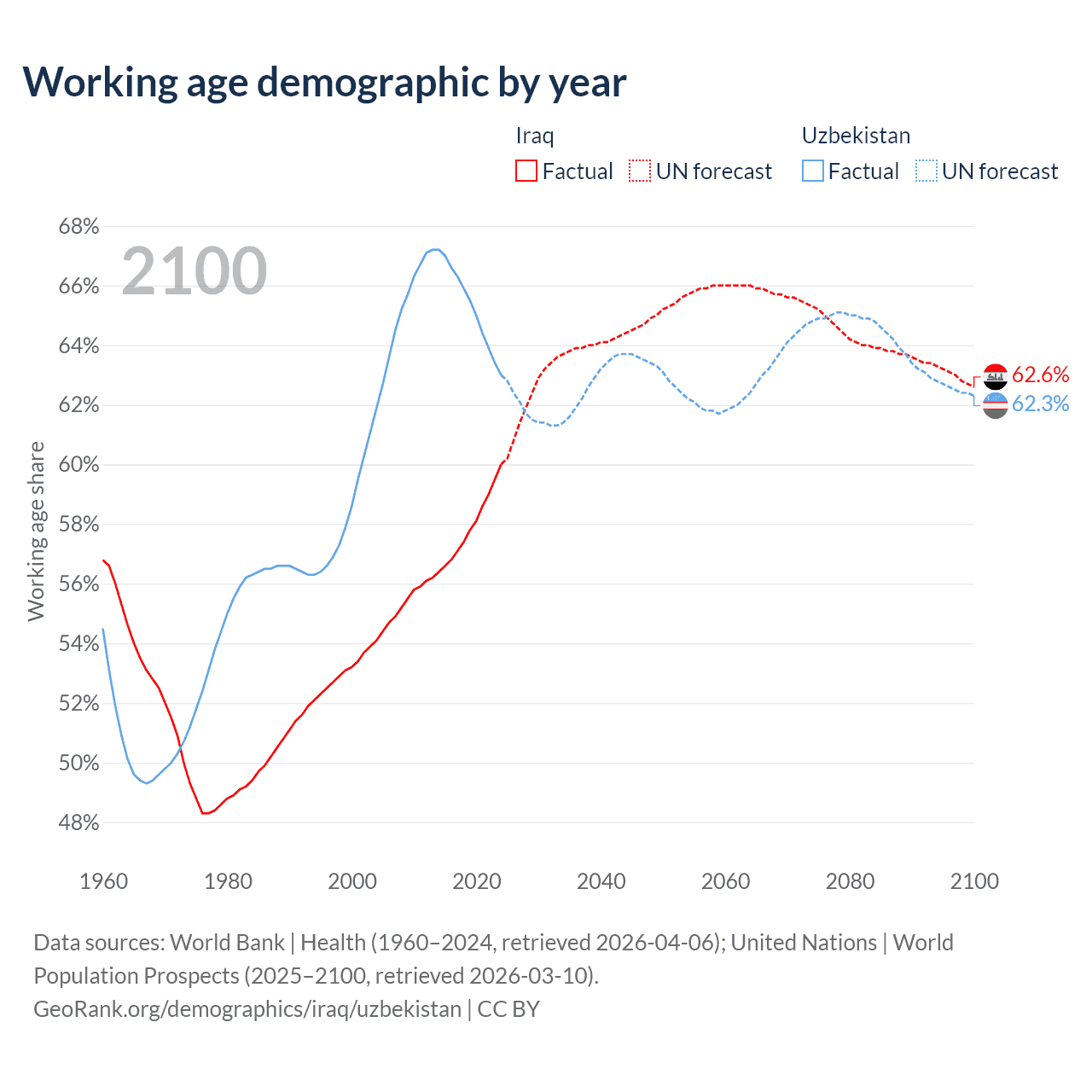 - Iraq has 29M working age adults (aged 15-64) vs 23.9M in Uzbekistan.