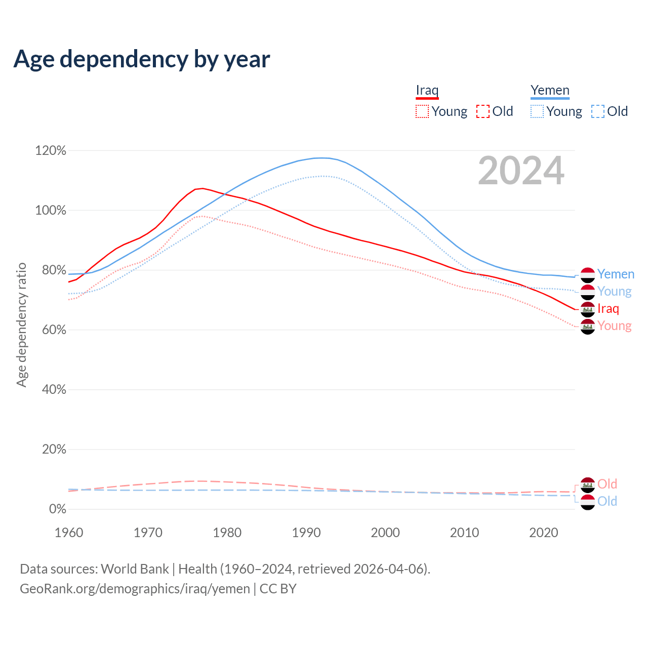 - The share of old-age demographic (65+) in Iraq is 3.41% vs 2.52% in Yemen.