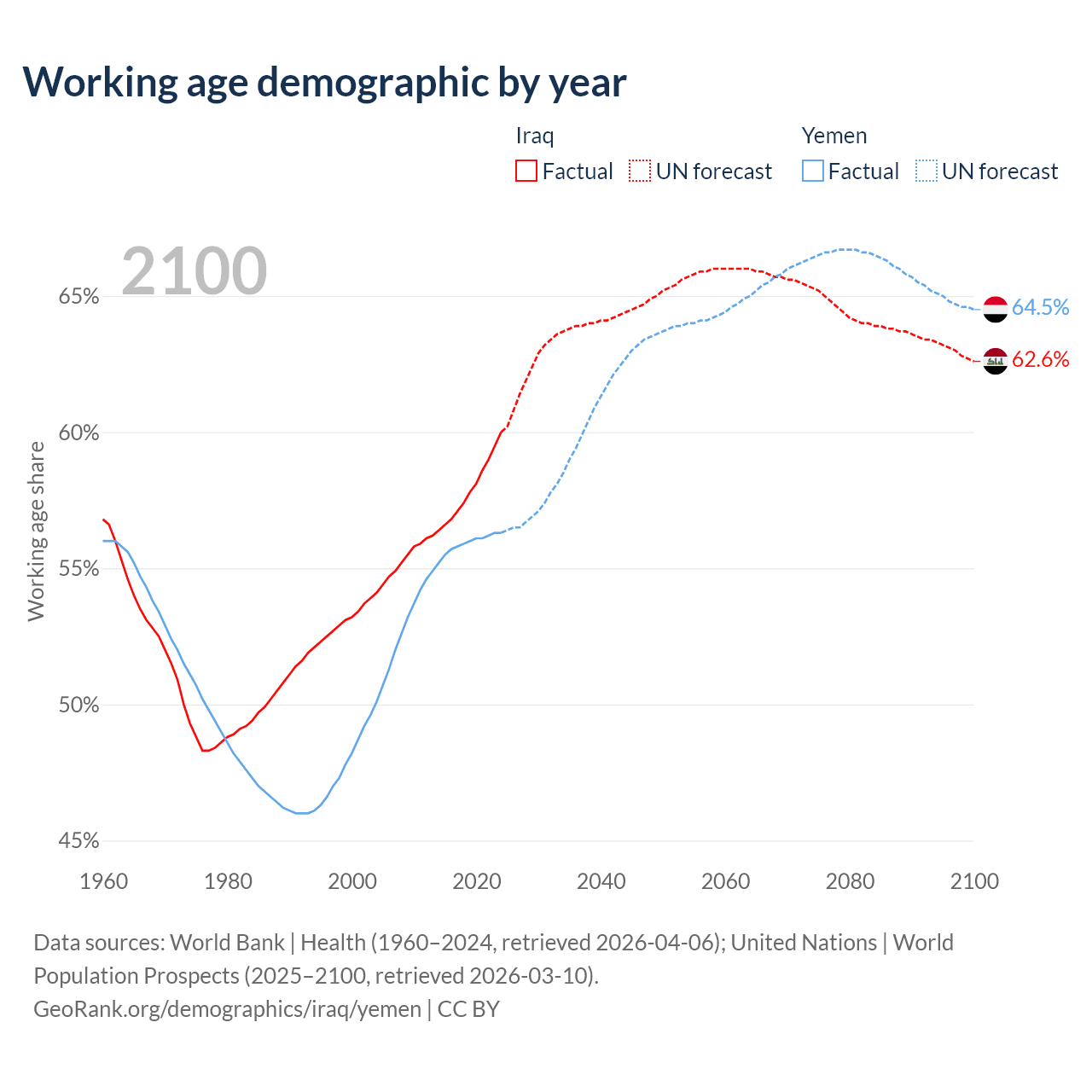 - Iraq has 29M working age adults (aged 15-64) vs 24.4M in Yemen.