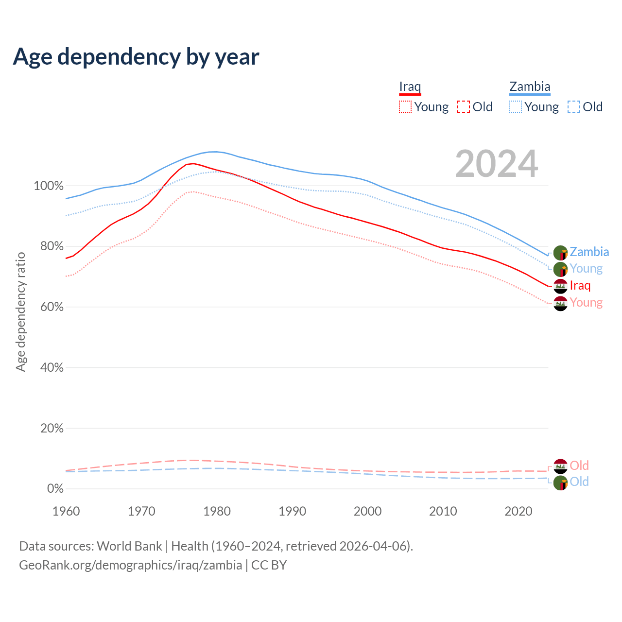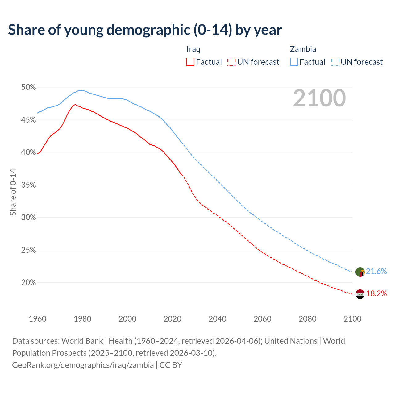 - Iraq is ranked 151/196 by median age (oldest to youngest) vs 182/196 for Zambia.