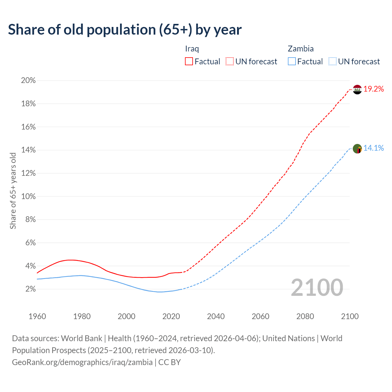 The share of older people aged 65 and over is 3.41% in Iraq and 1.95% in Zambia. Life expectancy in Iraq compared to Zambia .