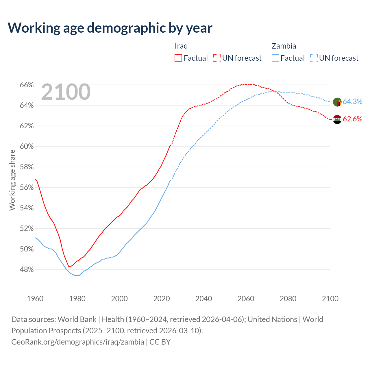 - Iraq has 29M working age adults (aged 15-64) vs 12.8M in Zambia.