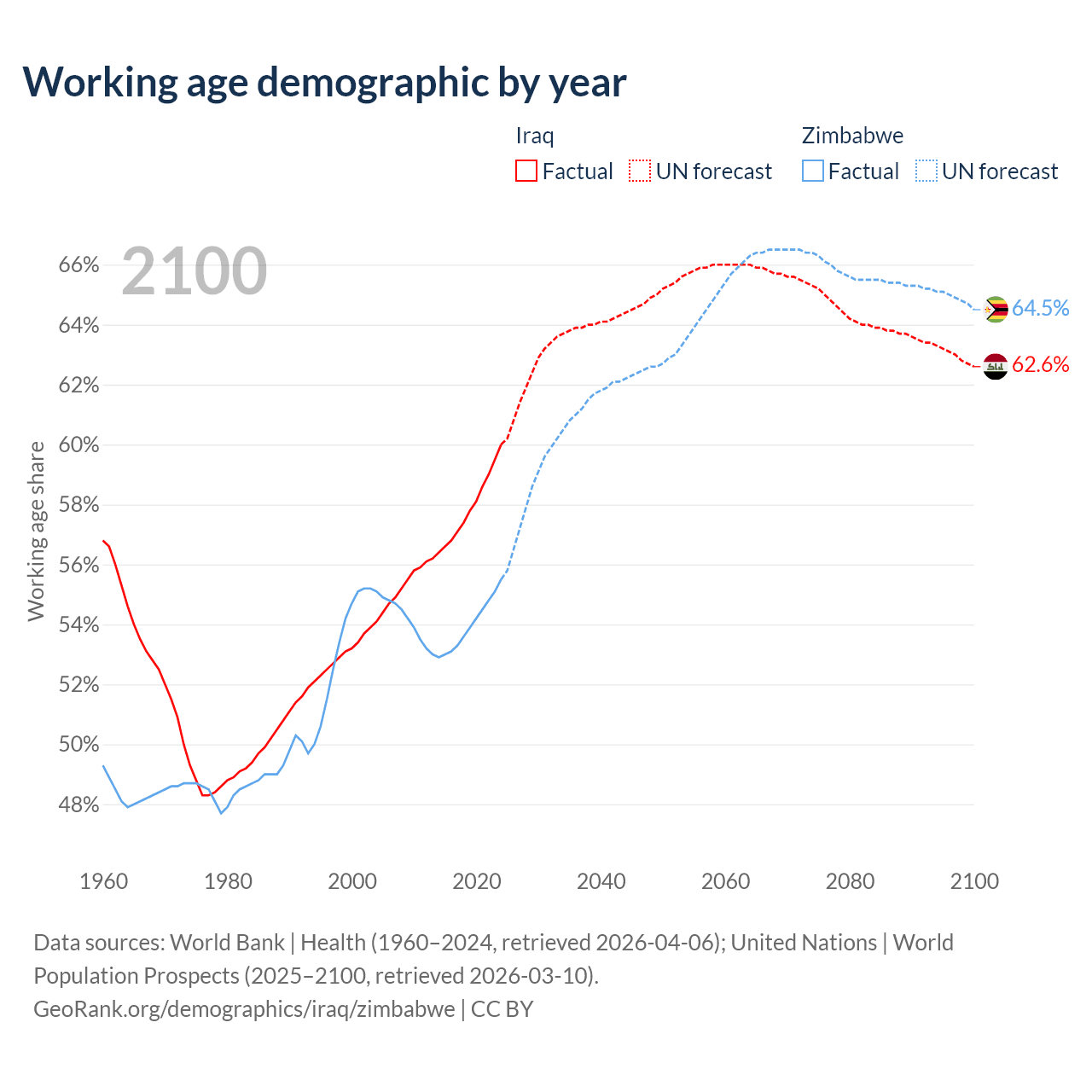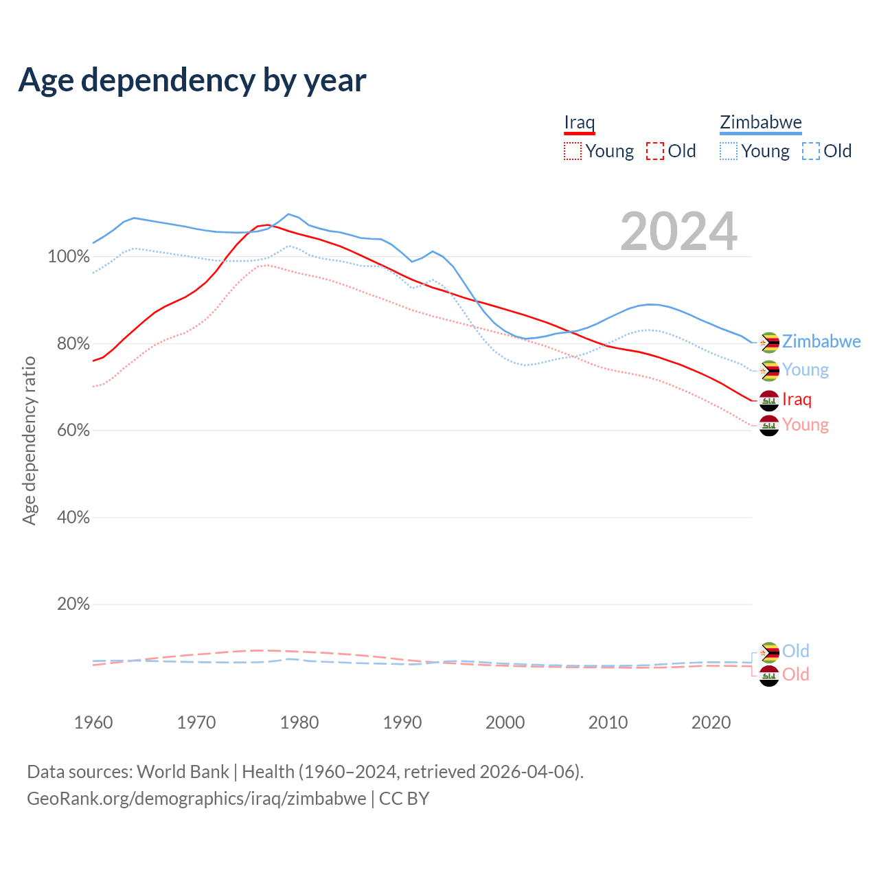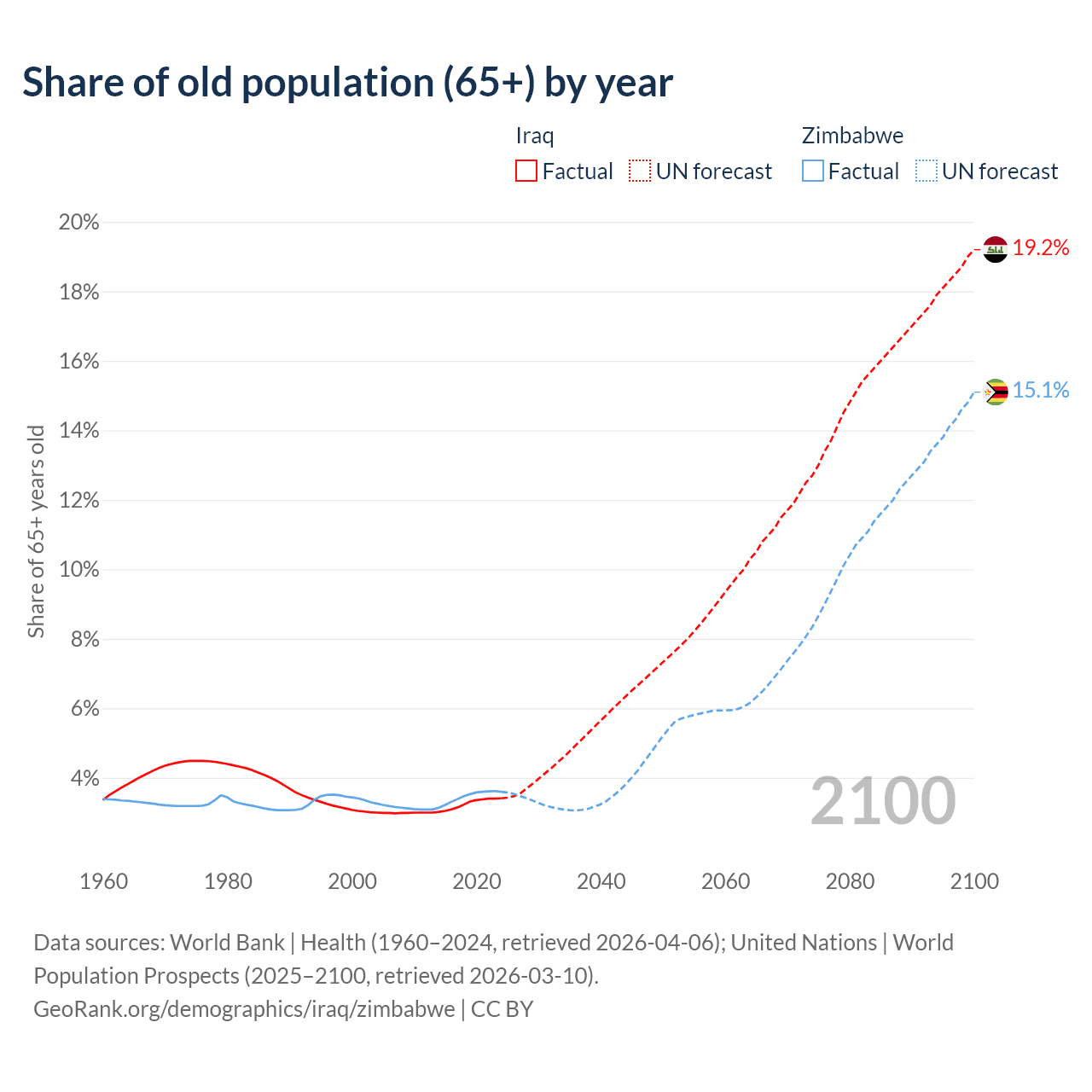 The share of older people aged 65 and over is 3.41% in Iraq and 3.6% in Zimbabwe. Life expectancy in Iraq compared to Zimbabwe .