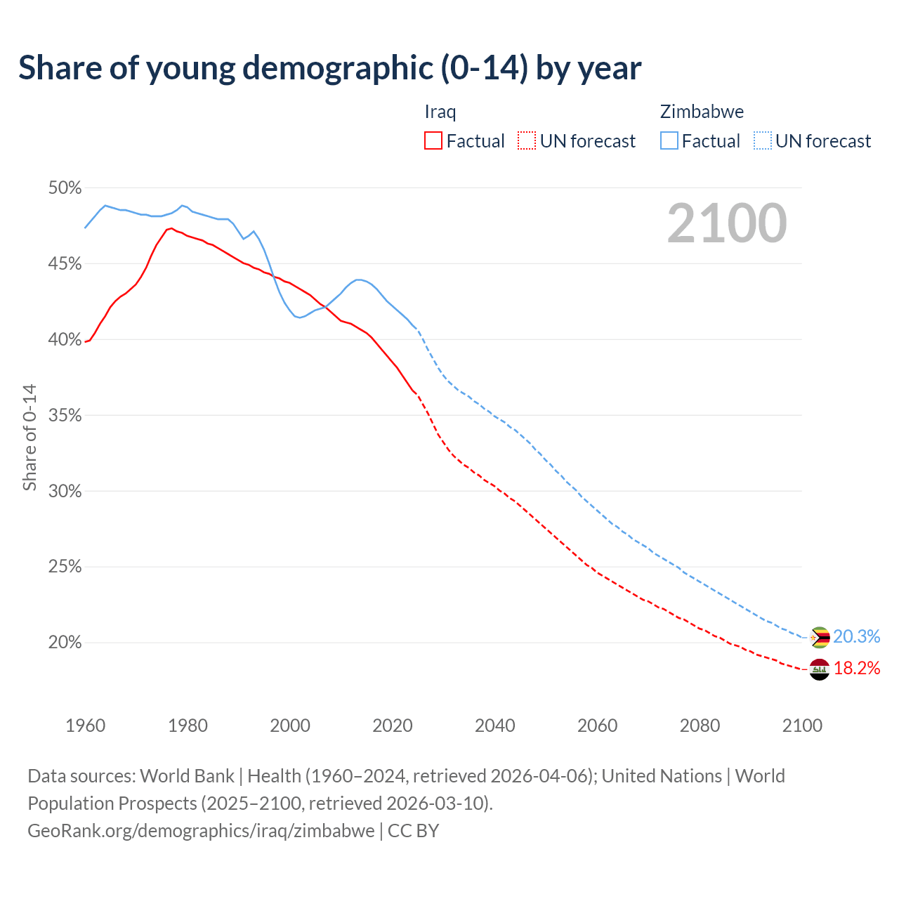 - The share of young demographic (0-15 years old) in Iraq is 36.6% vs 40.9% in Zimbabwe.