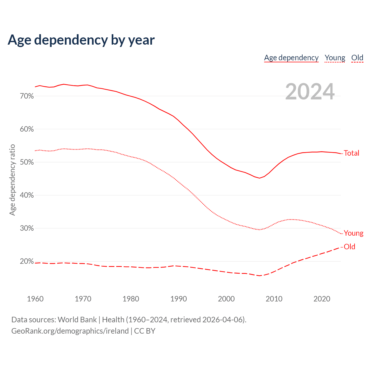 Data sources: World Bank | Health (1960–2024, retrieved 2026-04-06); U.S. Census Bureau (1960–2024, retrieved 2026-02-08).