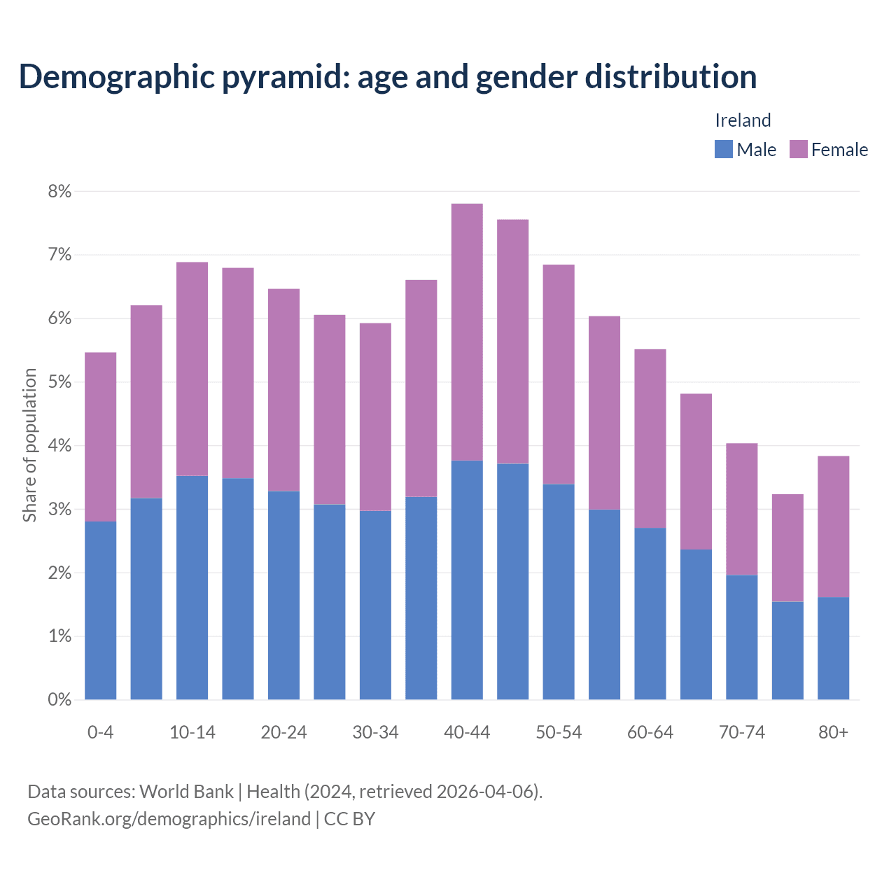 With a population of 5.4M people, Ireland has a median age of 39.7 years which makes it the 48/196 oldest country. 18.6% of the demographic are children 0-14 years old, 65.6% are working-age people aged 15-64, and 15.9% are older population aged 65+ years.