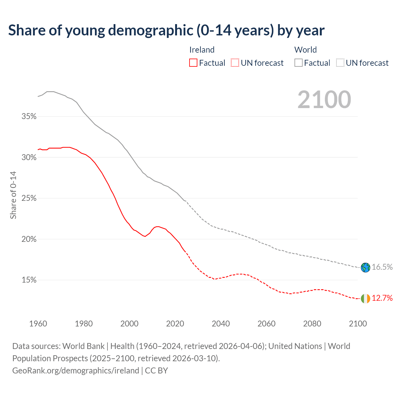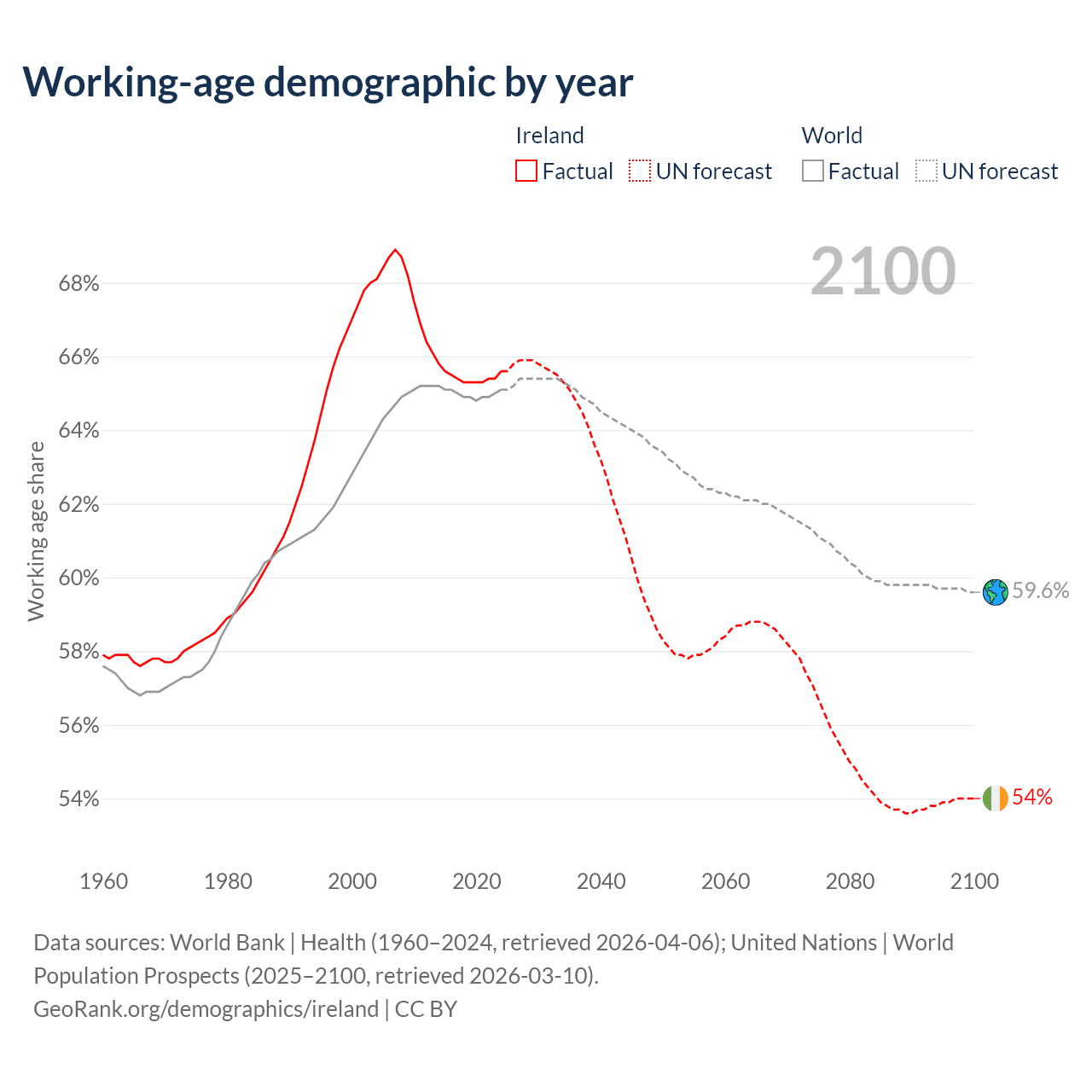 Median age in Ireland, 1960–2100