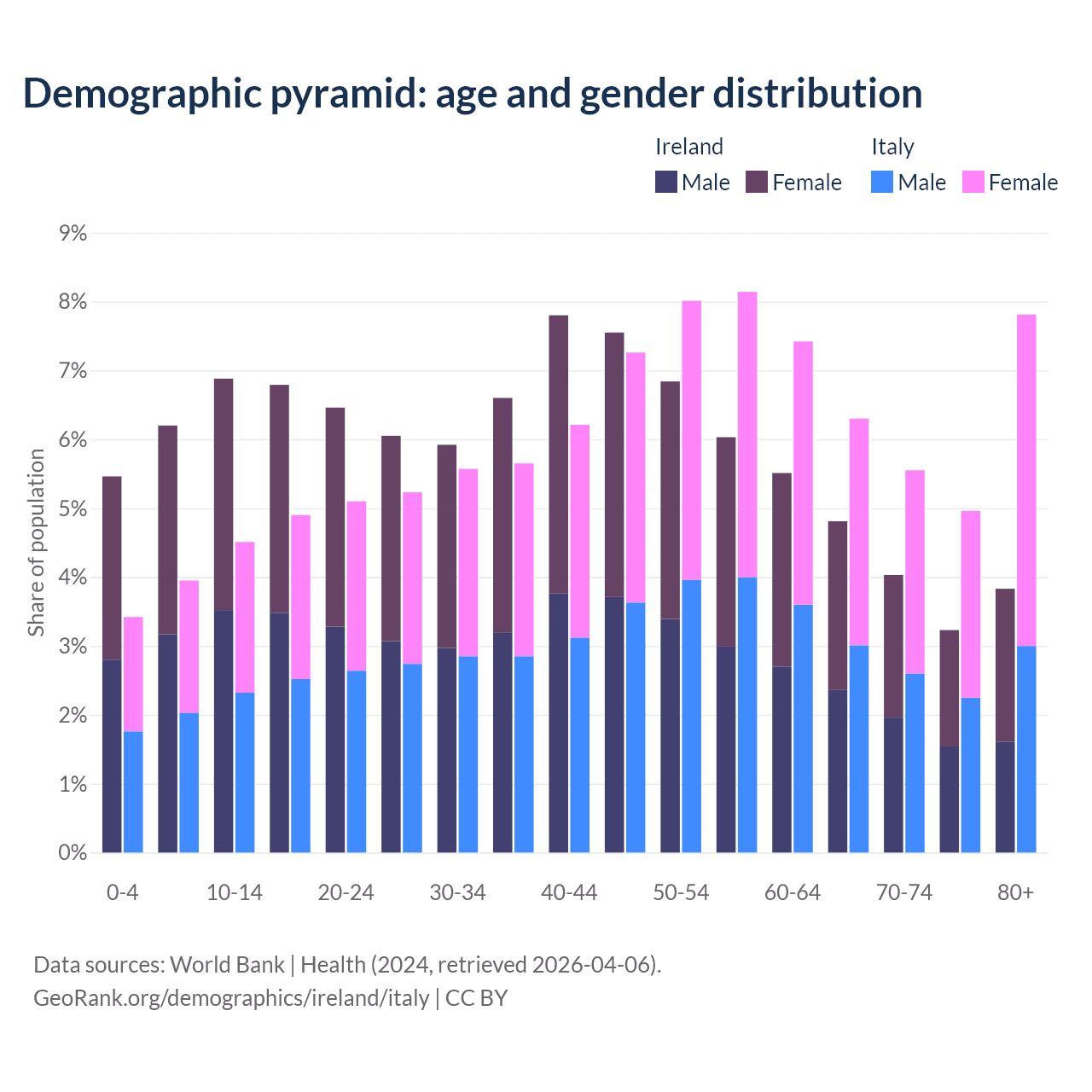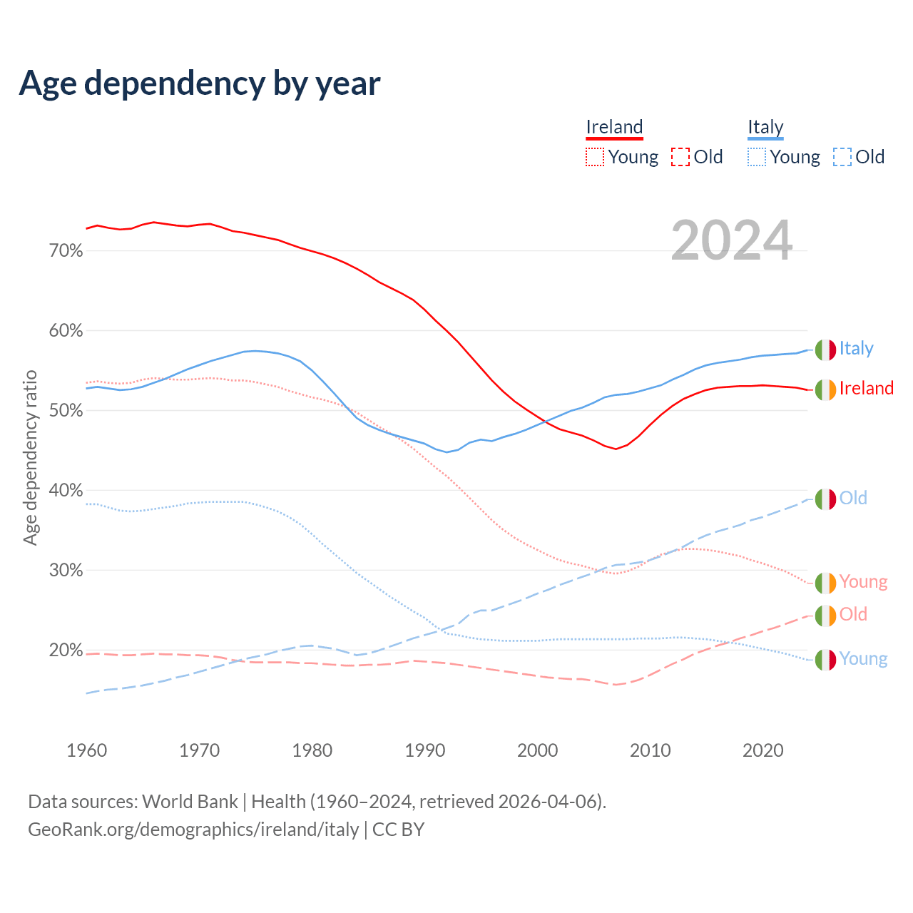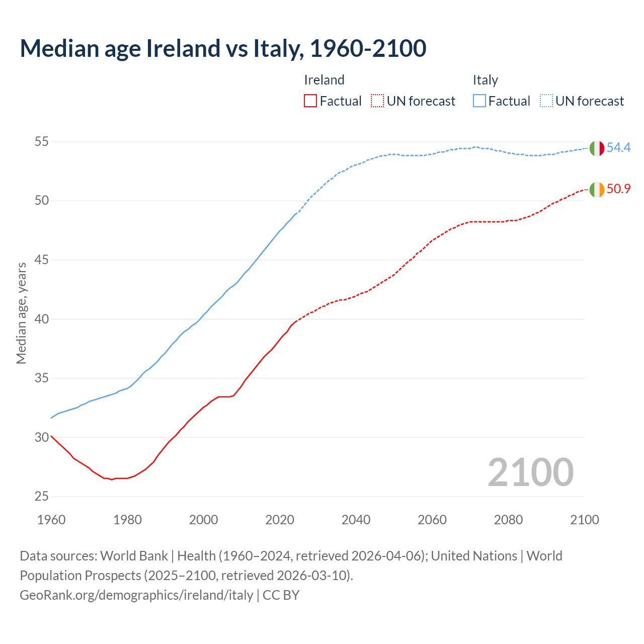 - Ireland is ranked 48/196 by median age (oldest to youngest) vs 4/196 for Italy.