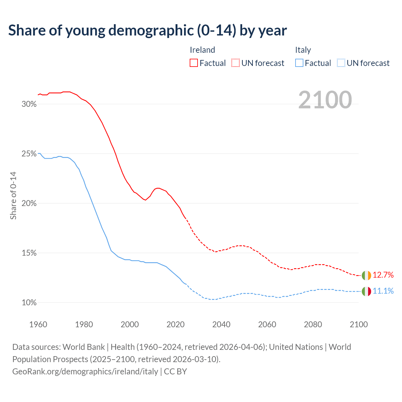 - The share of young demographic (0-15 years old) in Ireland is 18.6% vs 11.9% in Italy.