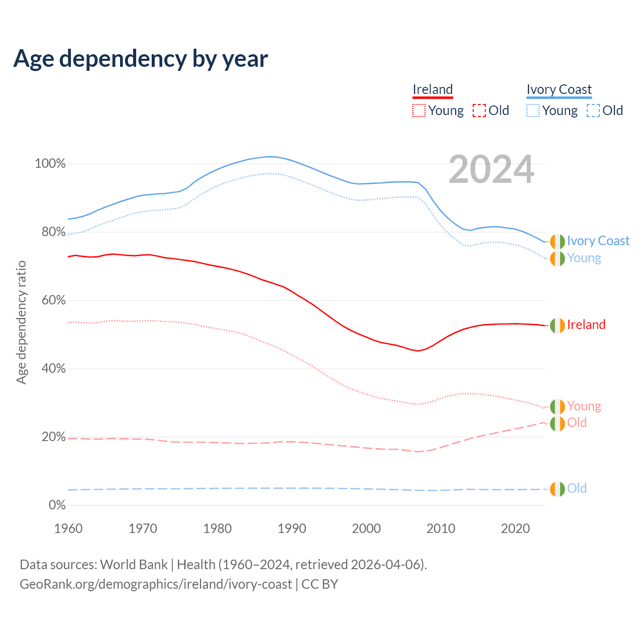 - Ireland is ranked 48/196 by median age (oldest to youngest) vs 175/196 for Ivory Coast.