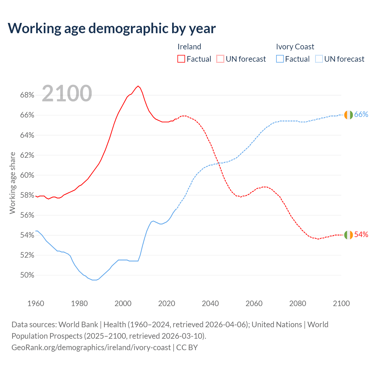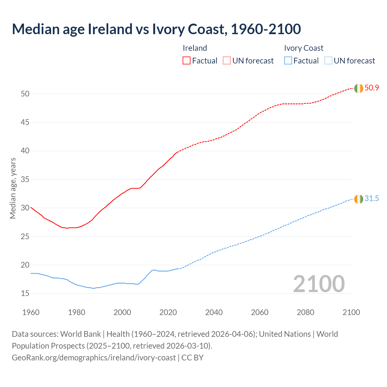 Median age Ireland vs Ivory Coast, 1960-2100