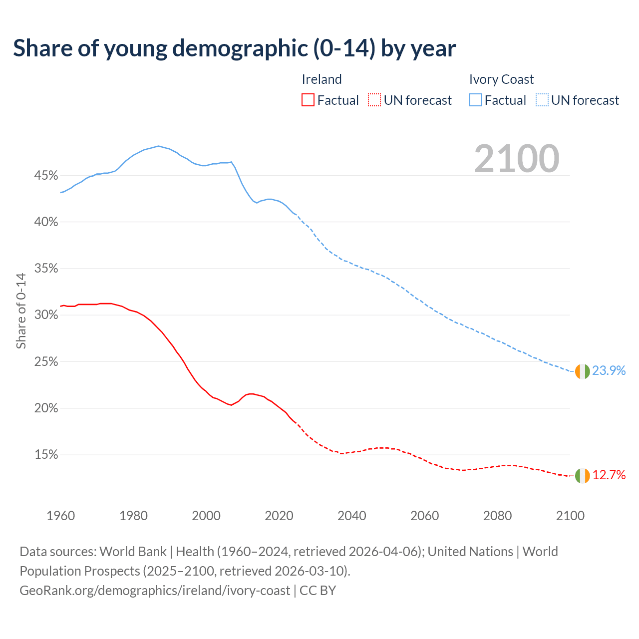 - The share of young demographic (0-15 years old) in Ireland is 18.6% vs 40.9% in Ivory Coast.