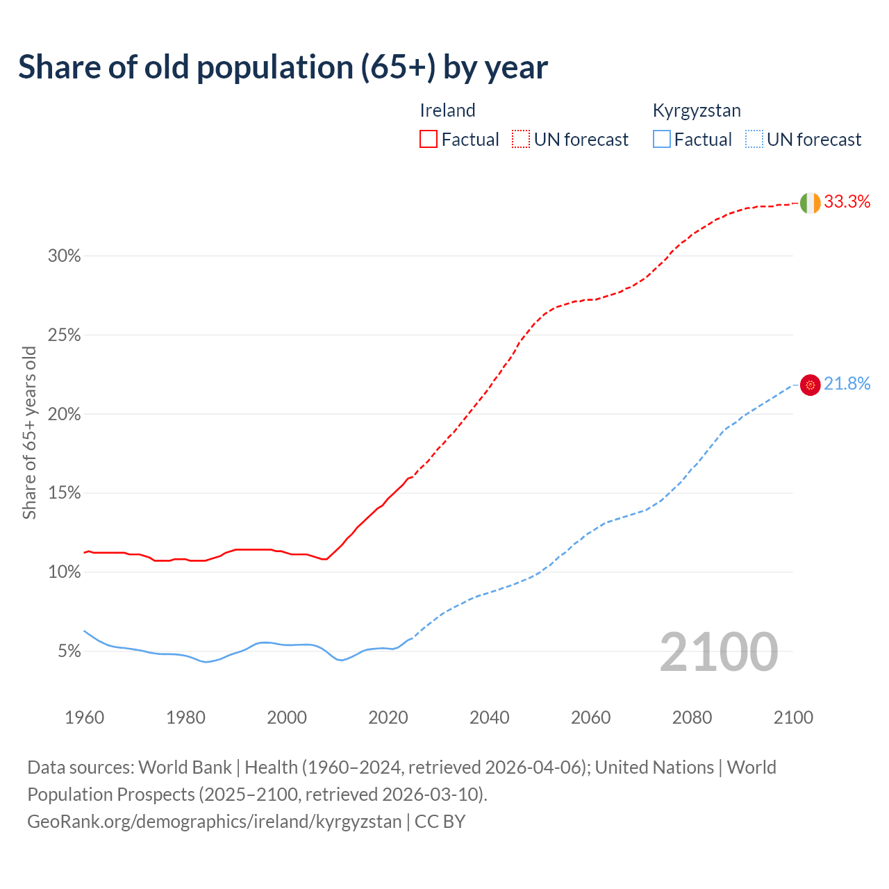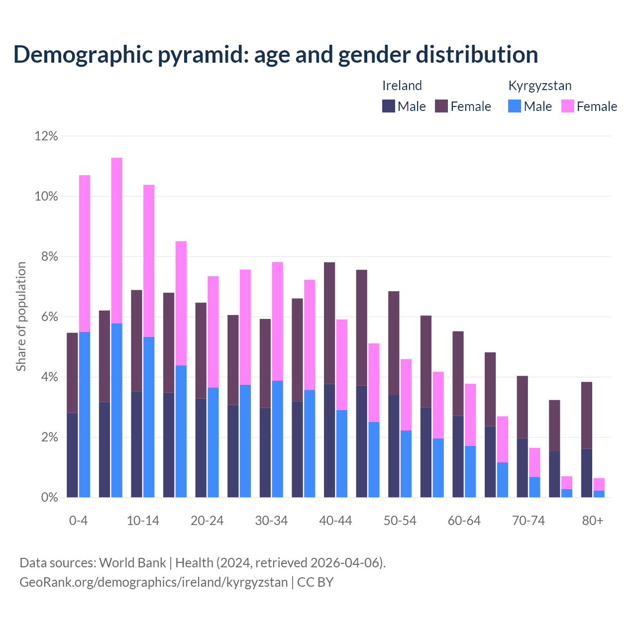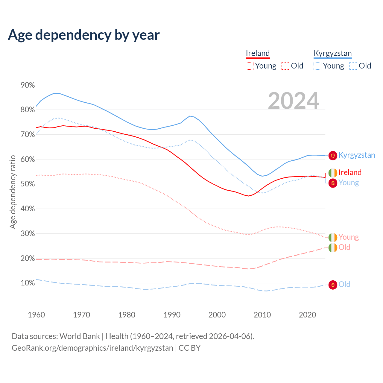 - The share of old-age demographic (65+) in Ireland is 15.9% vs 5.68% in Kyrgyzstan.