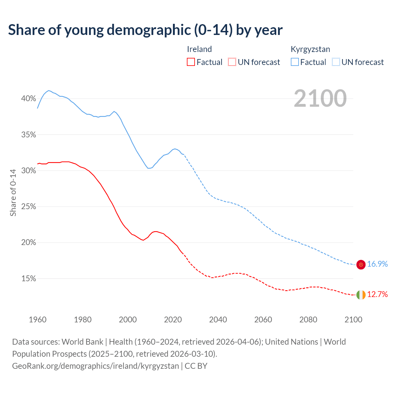 - The share of young demographic (0-15 years old) in Ireland is 18.6% vs 32.3% in Kyrgyzstan.
