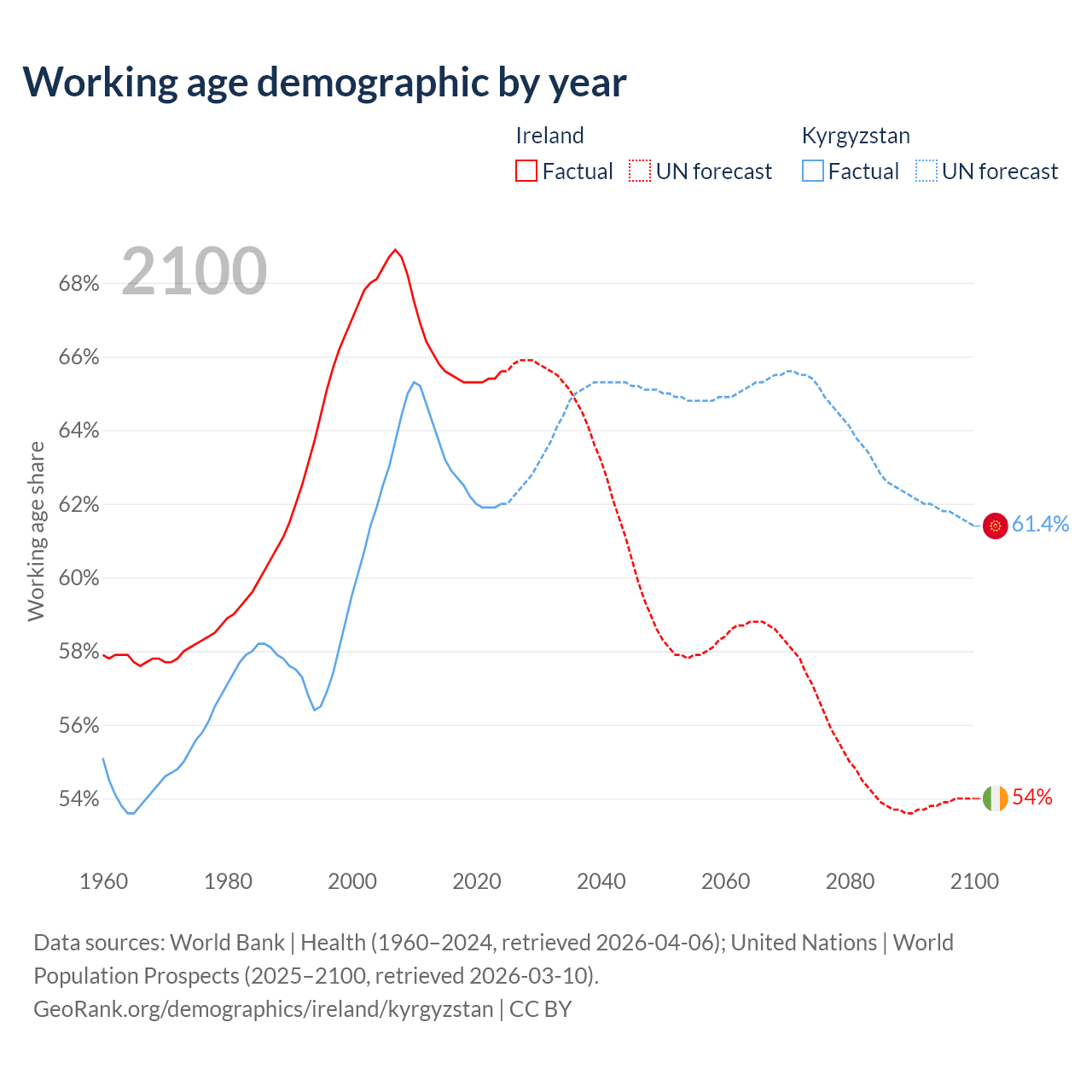 Median age Ireland vs Kyrgyzstan, 1960-2100