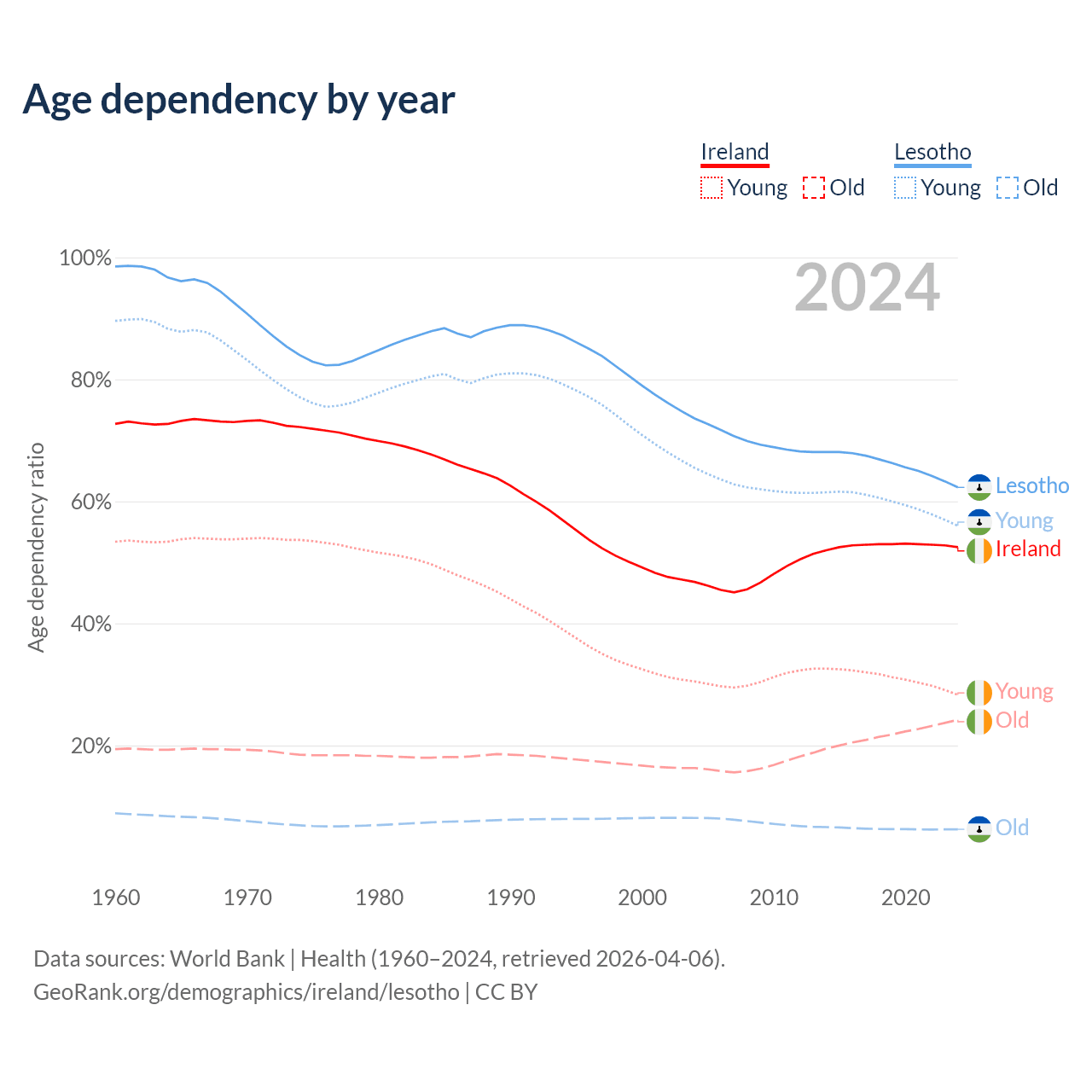 - Ireland is ranked 48/196 by median age (oldest to youngest) vs 143/196 for Lesotho.