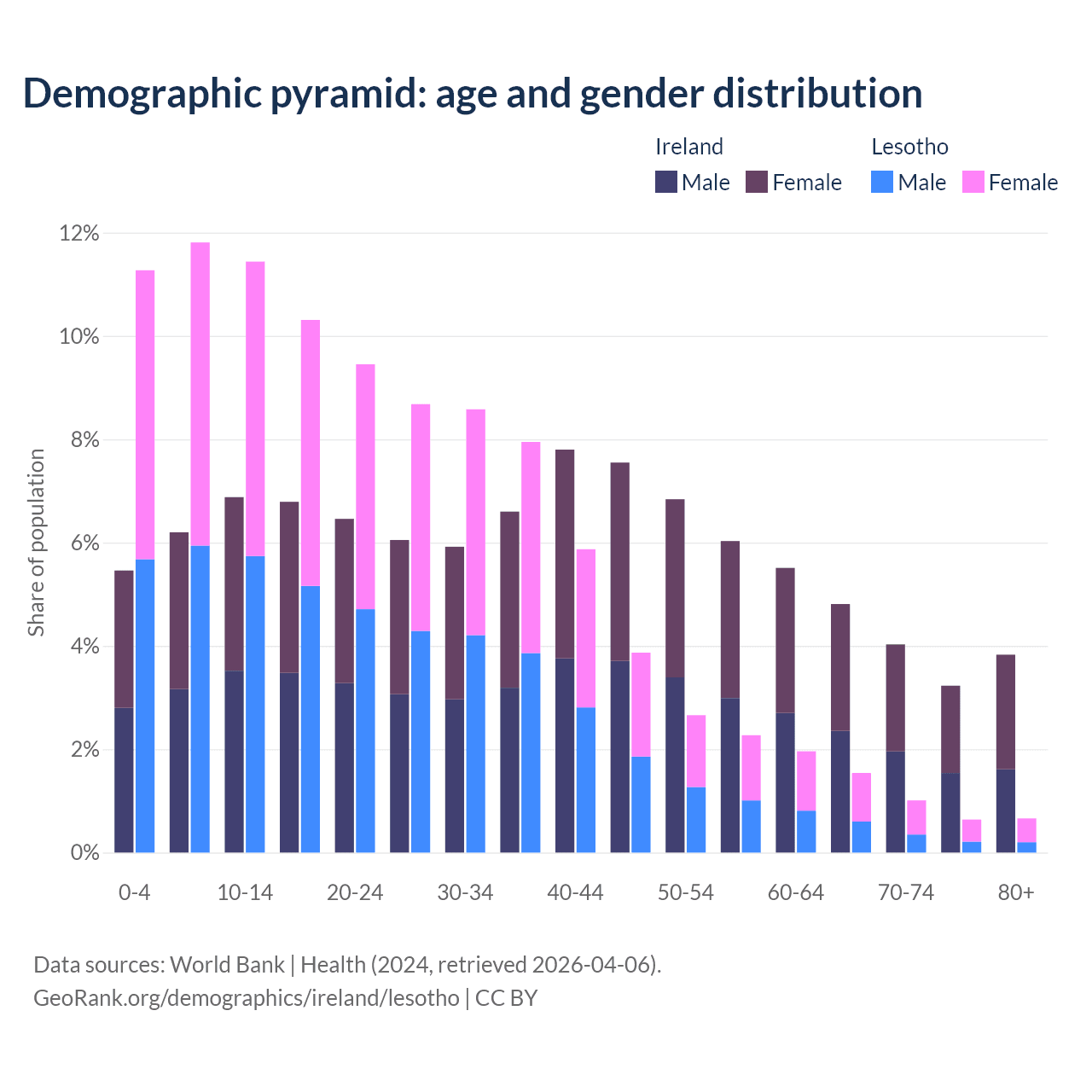 - As of 2026, the population of Ireland is 5.52M vs 2.4M in Lesotho - 2.3 times difference.