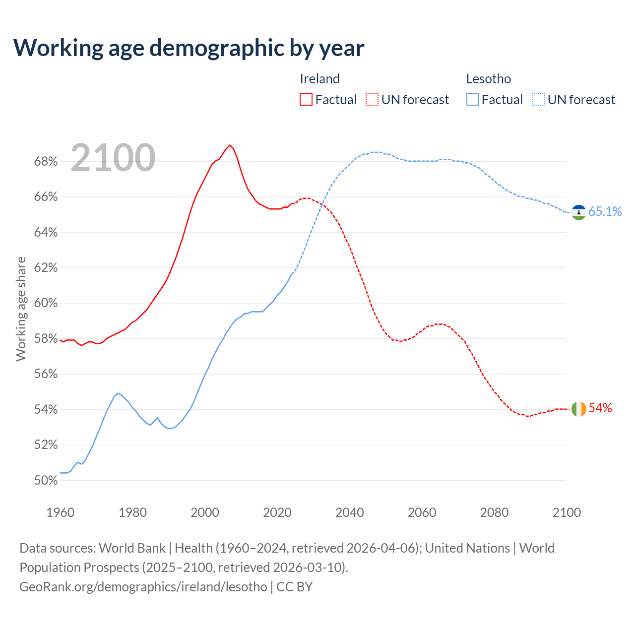 - Ireland has 3.62M working age adults (aged 15-64) vs 1.48M in Lesotho.