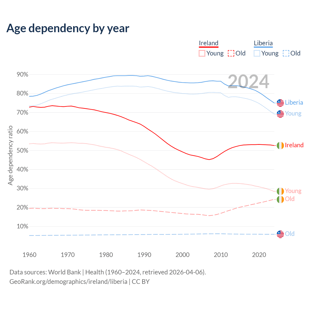 - Ireland is ranked 48/196 by median age (oldest to youngest) vs 169/196 for Liberia.