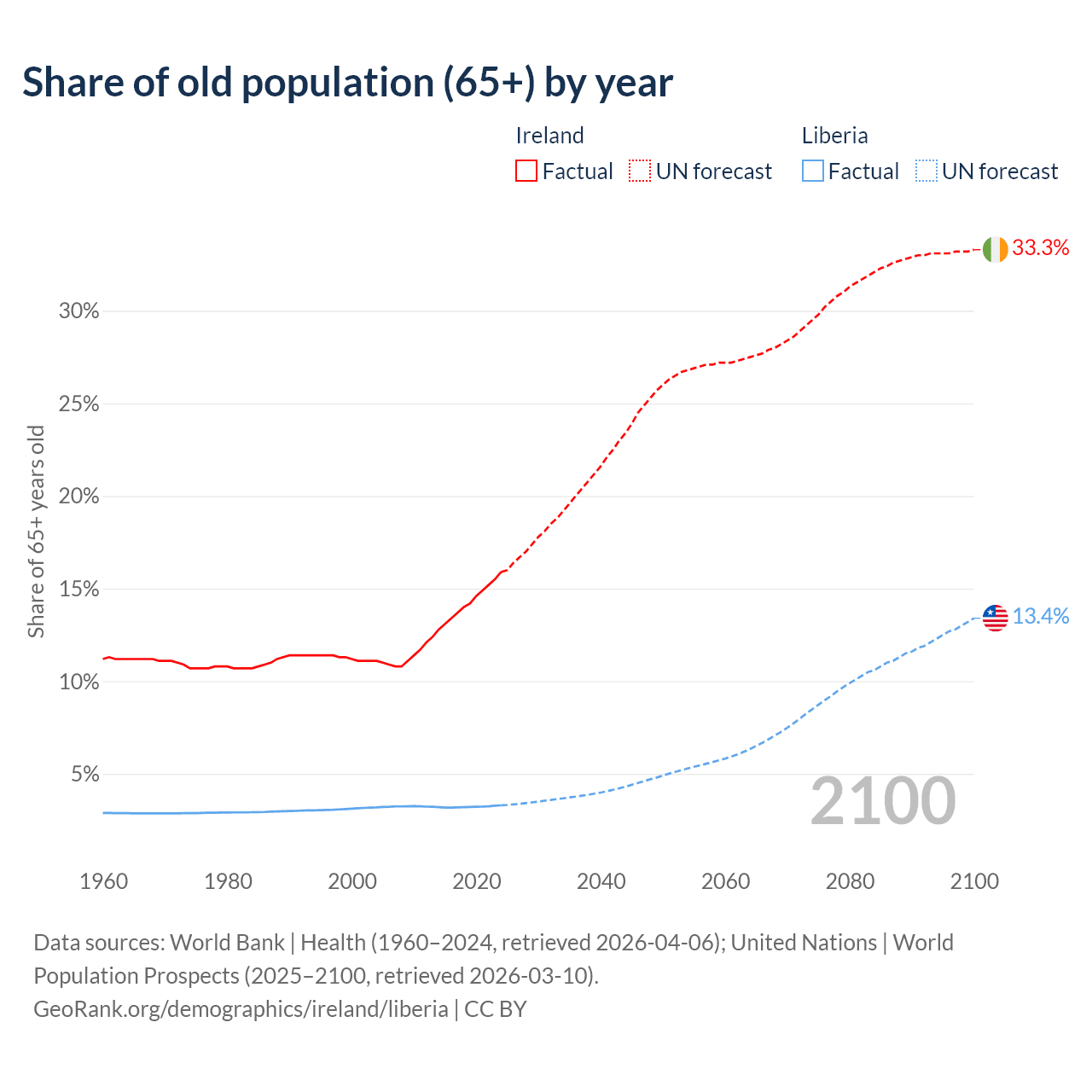 - The share of old-age demographic (65+) in Ireland is 15.9% vs 3.3% in Liberia.