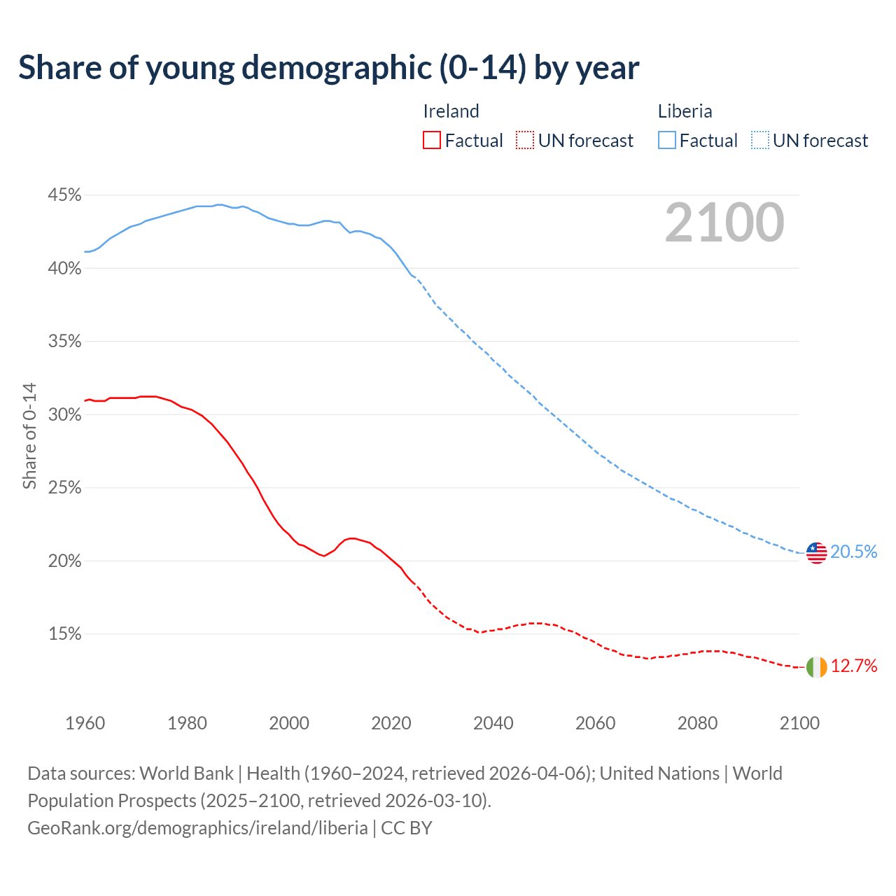 - The share of young demographic (0-15 years old) in Ireland is 18.6% vs 39.5% in Liberia.