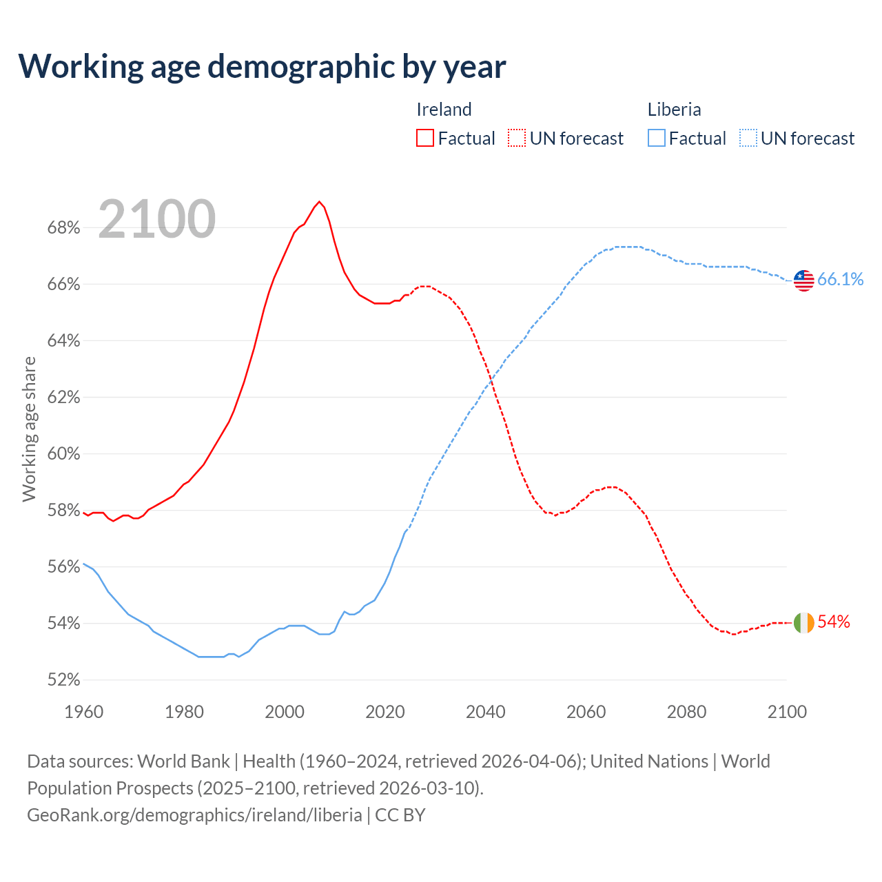 - Ireland has 3.62M working age adults (aged 15-64) vs 3.37M in Liberia.