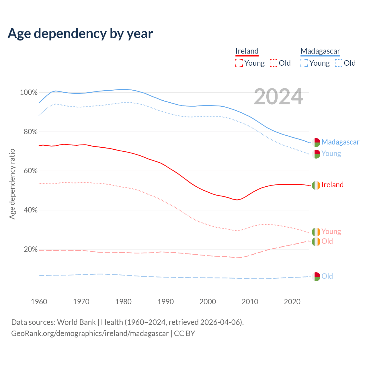 - Ireland is ranked 48/196 by median age (oldest to youngest) vs 165/196 for Madagascar.