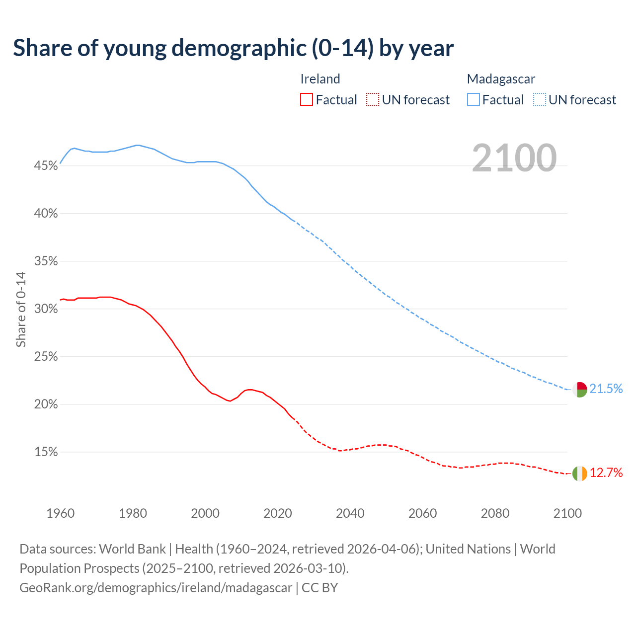 - The share of young demographic (0-15 years old) in Ireland is 18.6% vs 39.3% in Madagascar.
