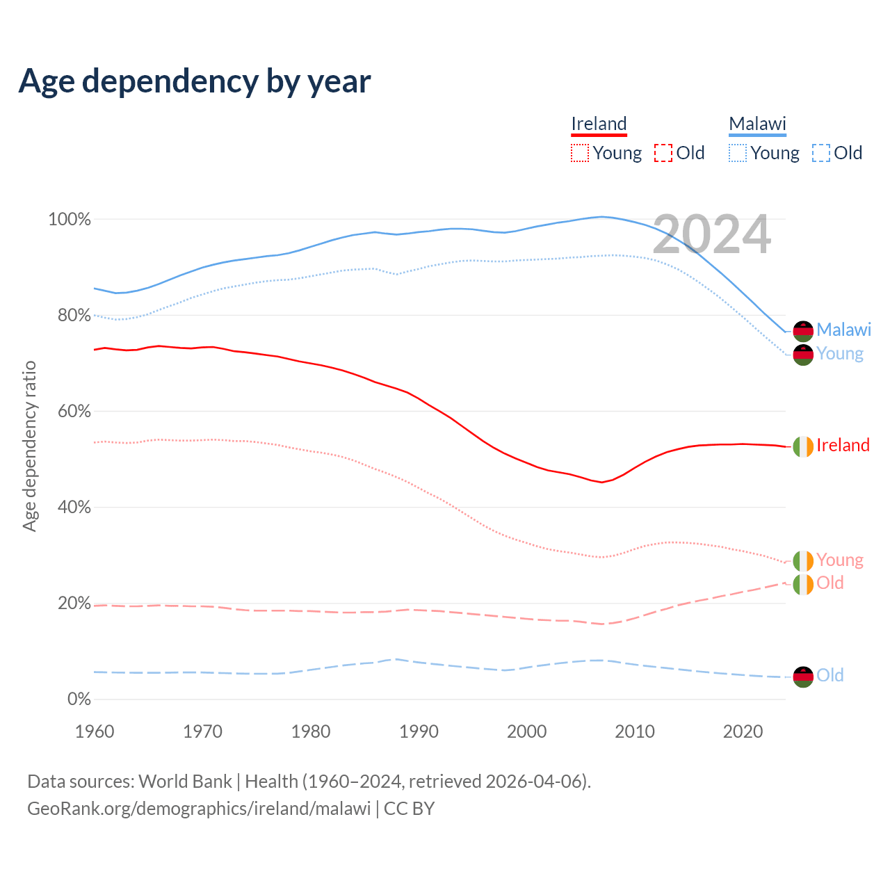 - The share of old-age demographic (65+) in Ireland is 15.9% vs 2.59% in Malawi.
