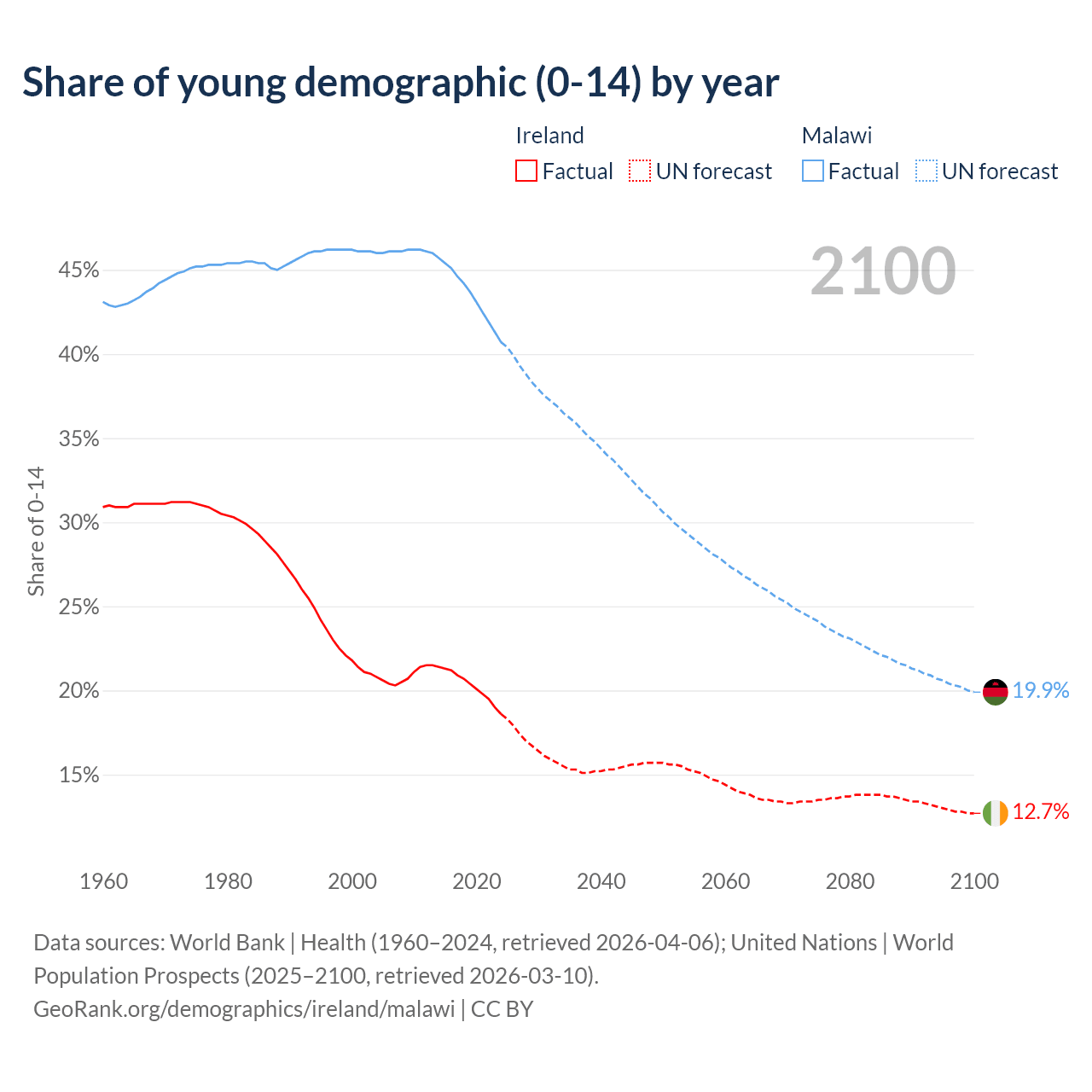 - The share of young demographic (0-15 years old) in Ireland is 18.6% vs 40.7% in Malawi.
