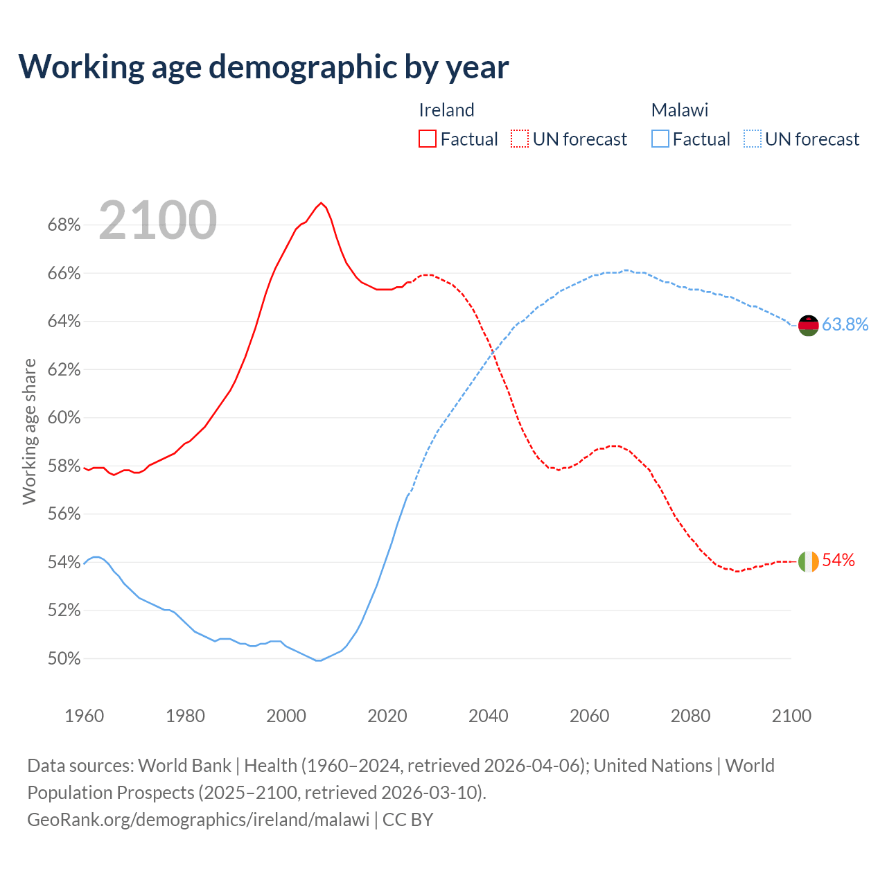 - Ireland has 3.62M working age adults (aged 15-64) vs 13M in Malawi.